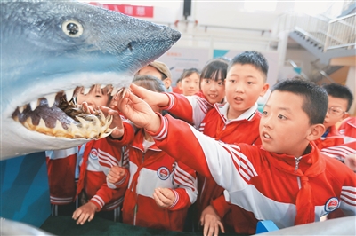 在甘肃省定西市日前举办的“山海相依,筑梦蔚蓝”山东青岛·甘肃定西海洋科普东西部协作主题活动中,定西市安定区关川实验学校的学生在观看海洋生物标本。新华社记者 王克贤摄