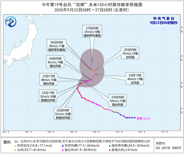 今年第19号台风“浣熊”(超强台风级)的中心今天(9月22日)早晨5点钟位于日本东京东偏南方向约1250公里的西北太平洋洋面上,就是北纬29.6度、东经150.9度,中心附近最大风力有16级(52米/秒),中心最低气压为935百帕,七级风圈半径200-300公里,十级风圈半径100-120公里,十二级风圈半径70公里。