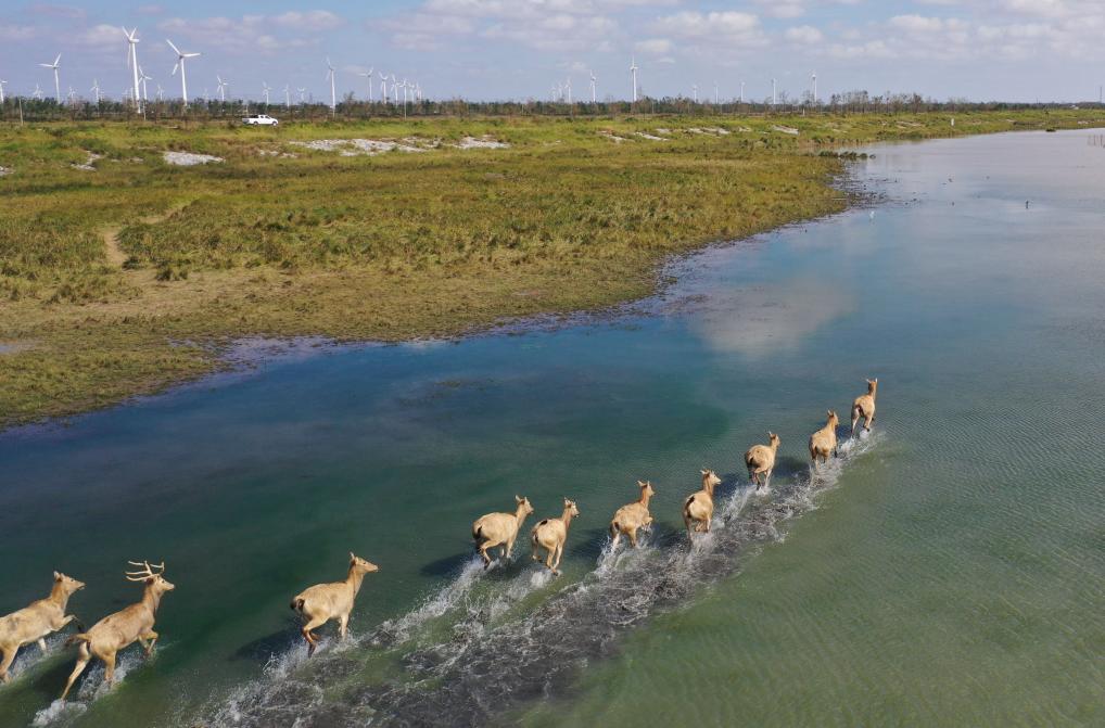 2024年12月21日在大丰野鹿荡拍摄的麋鹿(无人机照片)。新华社记者 季春鹏 摄