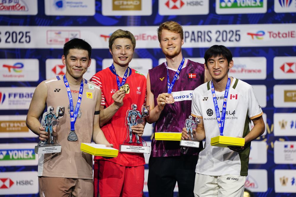 8月31日,冠军中国选手石宇奇(左二)、亚军泰国选手昆拉武特(左一)和季军丹麦选手安东森(右二)、加拿大选手赖浩俊在颁奖仪式上。新华社记者 彭子洋 摄