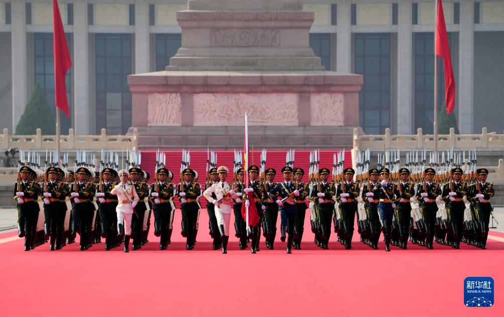 9月3日,纪念中国人民抗日战争暨世界反法西斯战争胜利80周年大会在北京隆重举行。这是国旗护卫队从人民英雄纪念碑基座出发,走向旗杆基座。新华社记者 杜宇 摄