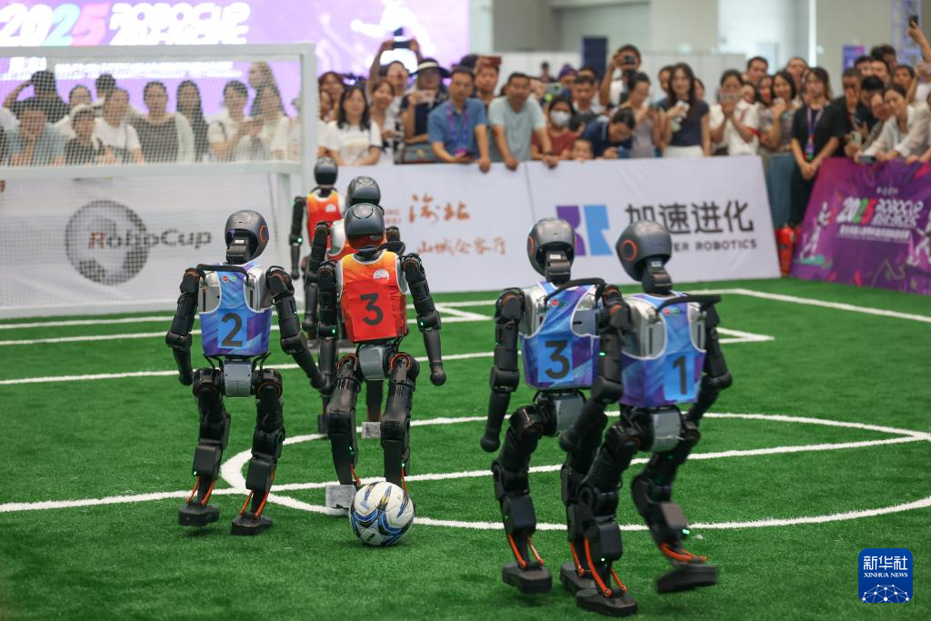 这是9月5日在2025世界智能产业博览会拍摄的机器人3V3足球赛。新华社记者 陈诚 摄