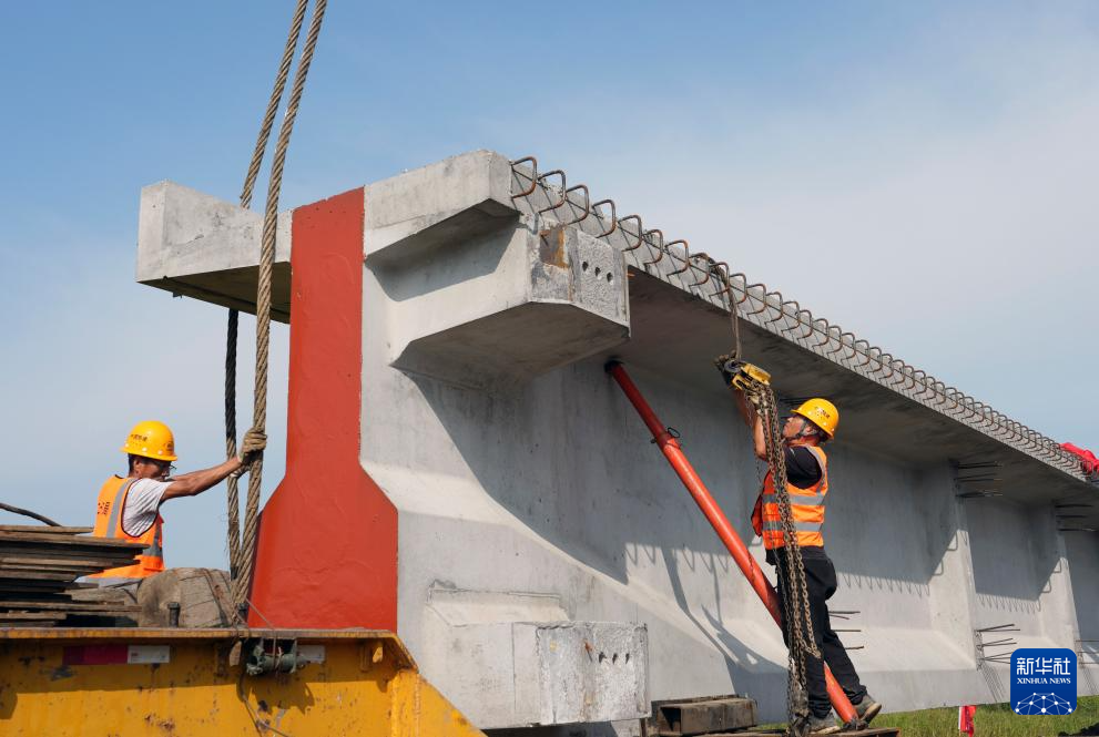 9月5日,工人在佳木斯至同江铁路扩能改造工程同江特大桥架梁现场施工作业。新华社记者 王松 摄