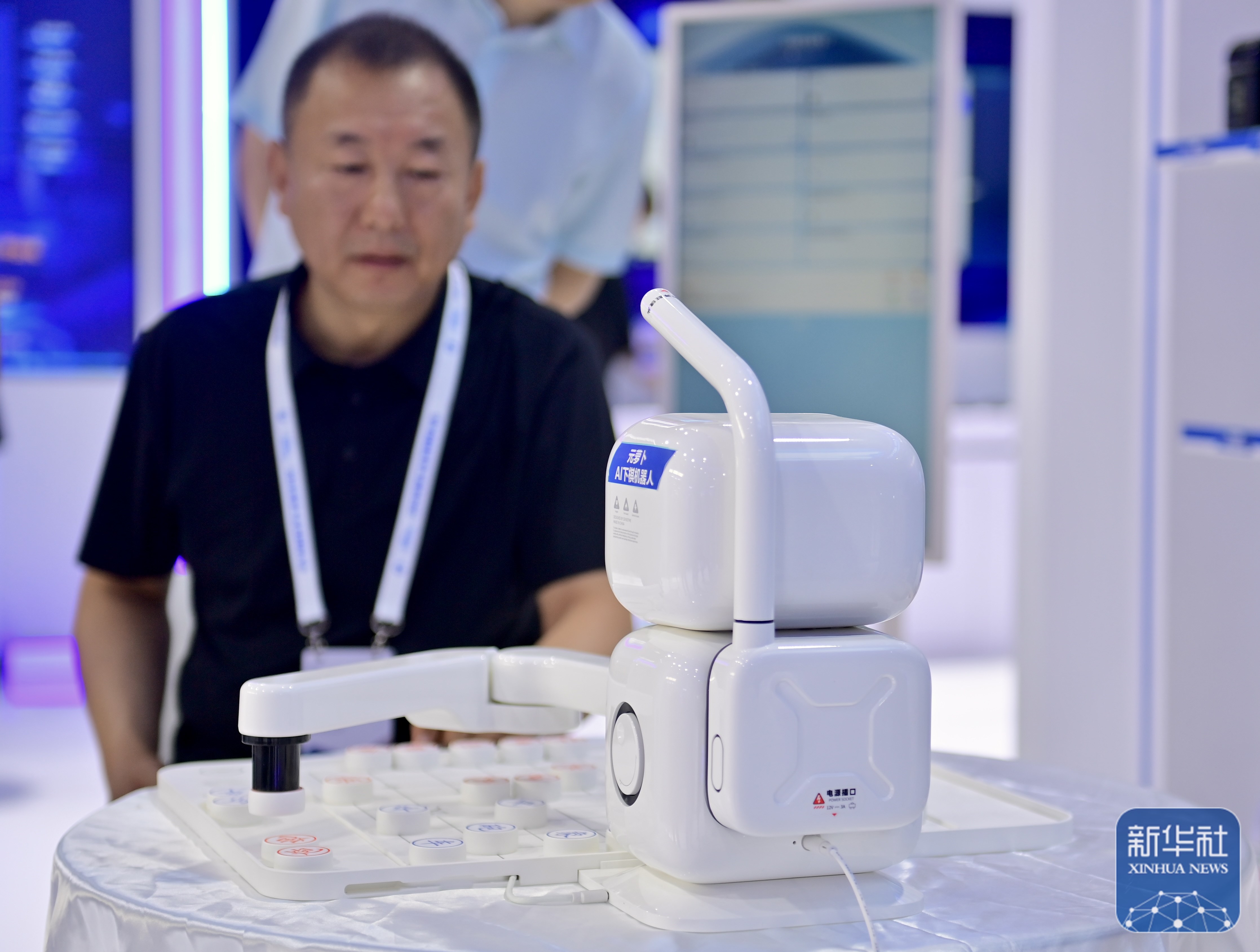 ↑ 9月6日,一名参观者在体验AI下棋机器人。新华社记者 吴青昊 摄