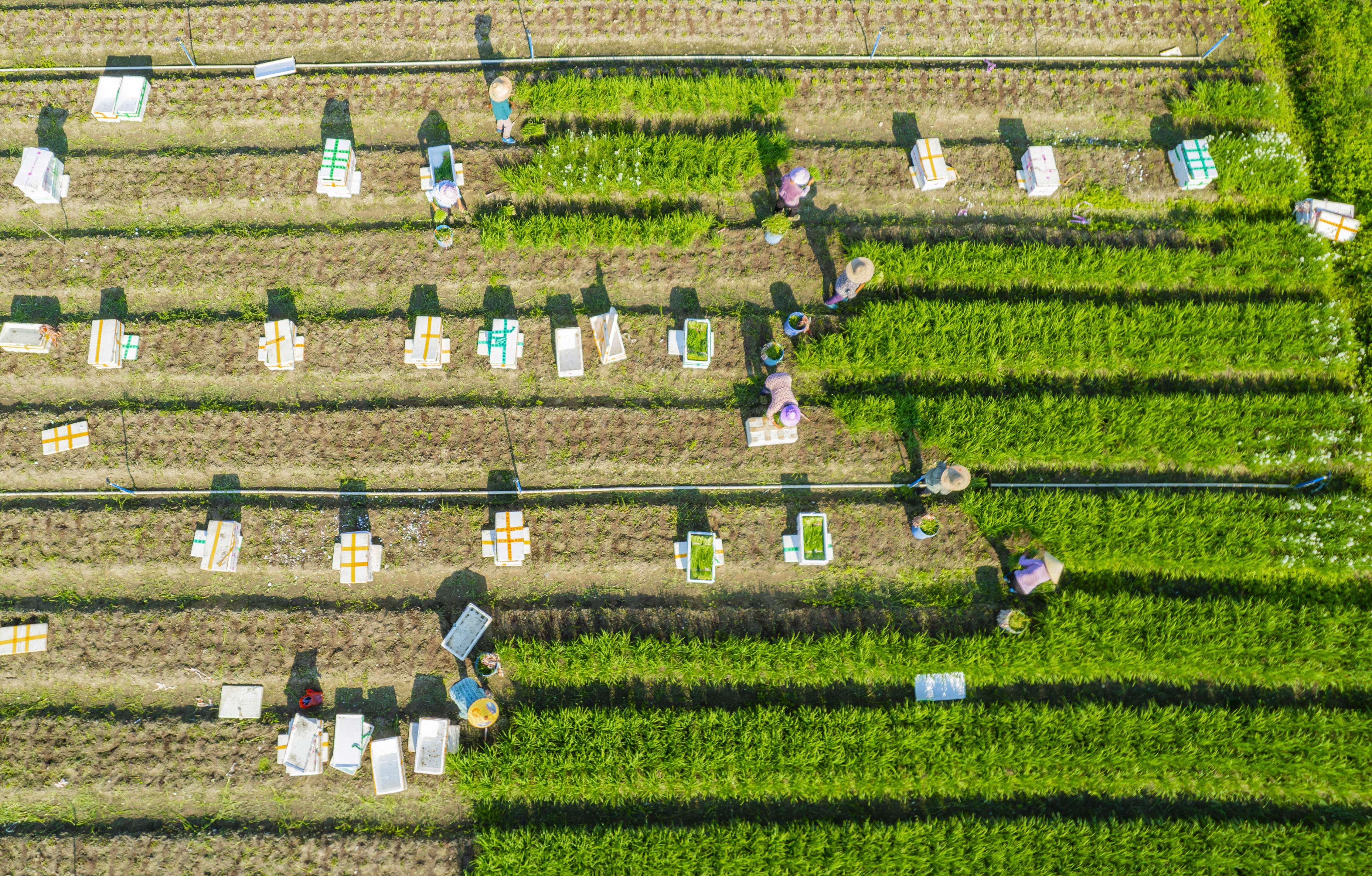 ↑ 9月4日,农民在江西省赣州市信丰县大桥镇青光村的韭菜田里采收韭菜(无人机照片)。新华社发(李健 摄)