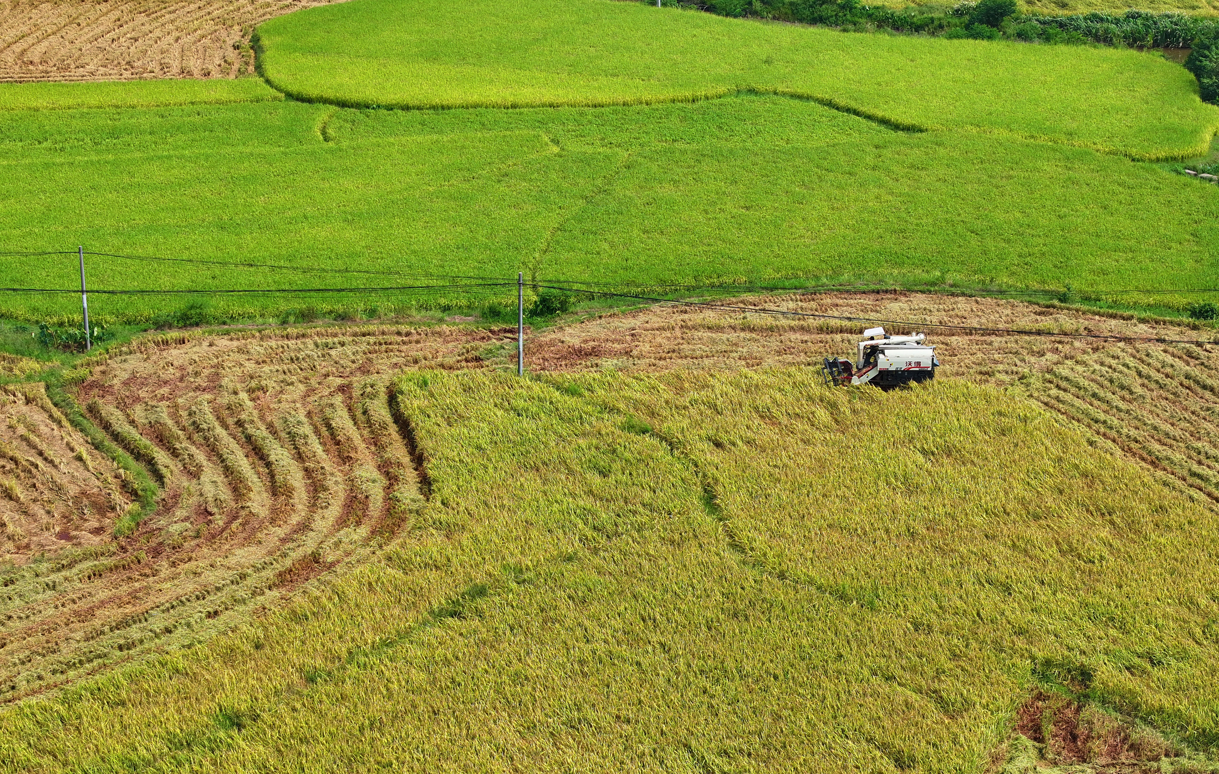 ↑ 9月6日,村民在云南省文山壮族苗族自治州薄竹镇莫哈纪村稻田里收割水稻(无人机照片)。新华社发(熊平祥 摄)