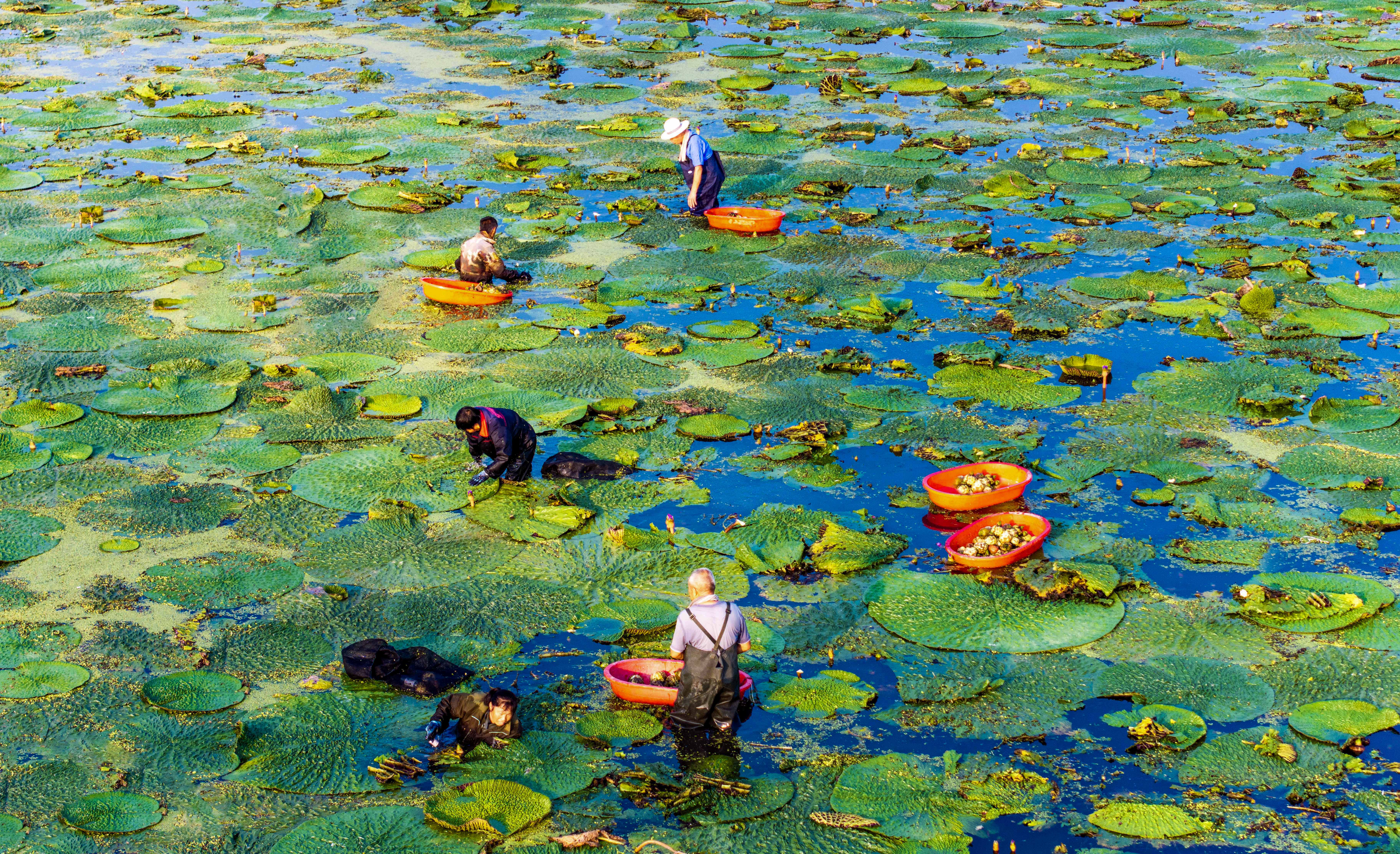 ↑ 9月6日,农民在江苏省泰州市姜堰区顾高镇申俞村采收芡实(无人机照片)。新华社发(周社根 摄)