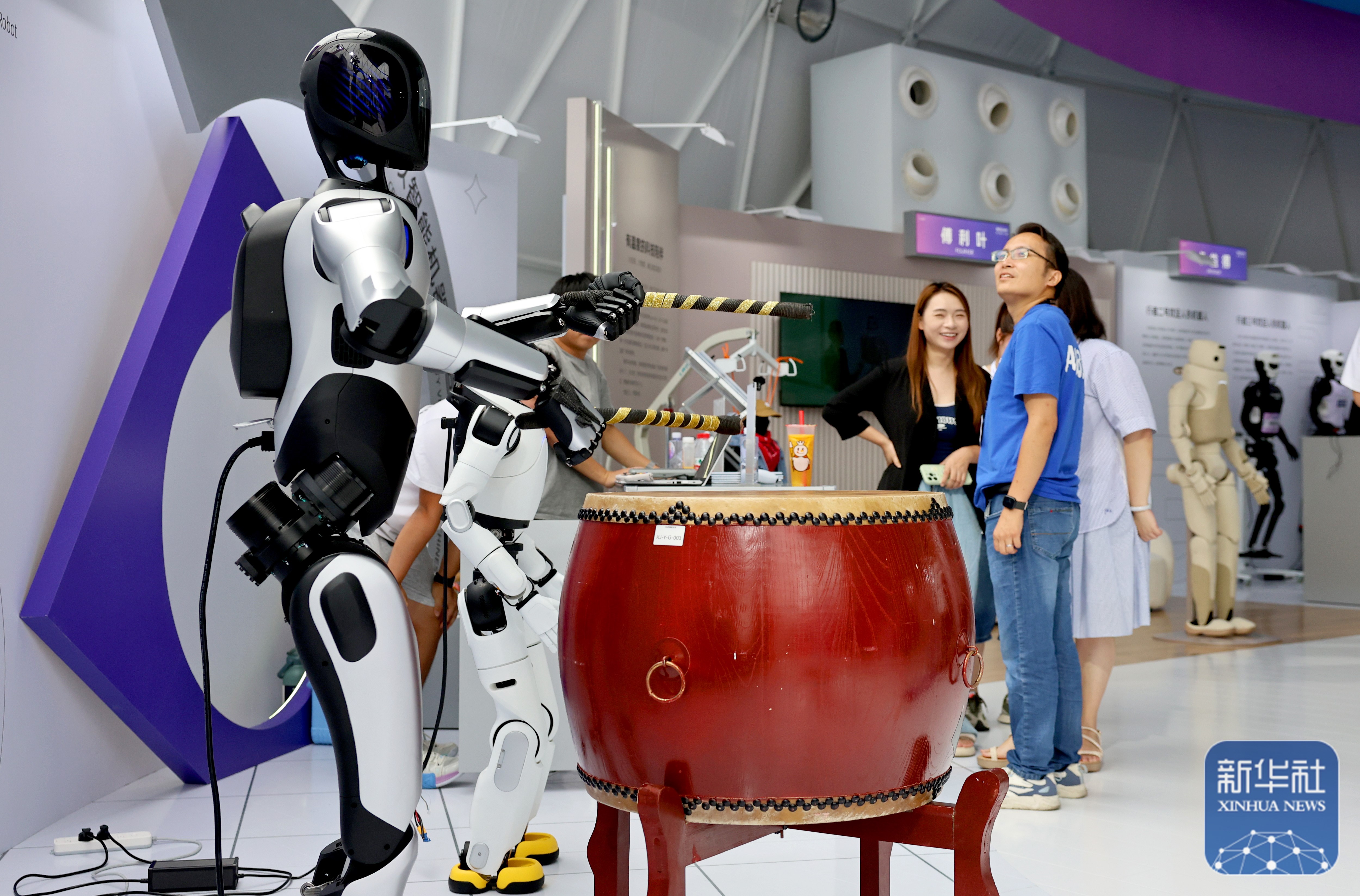 ↑9月10日,机器人小镇展区的机器人在表演敲鼓。