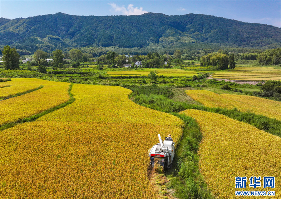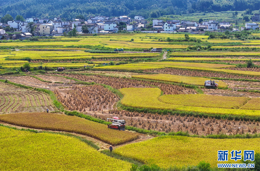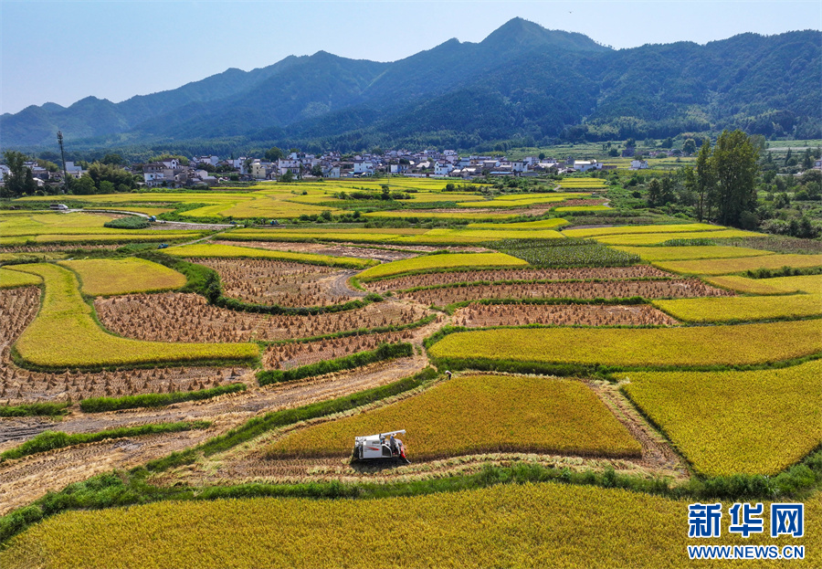 近日,安徽省黄山市黟县碧阳镇关麓村的水稻陆续成熟,农民抢抓晴好天气进行收割。收割机马力全开,在金灿灿的稻田里来回作业,田间地头一派繁忙景象。新华网发(施亚磊 摄)