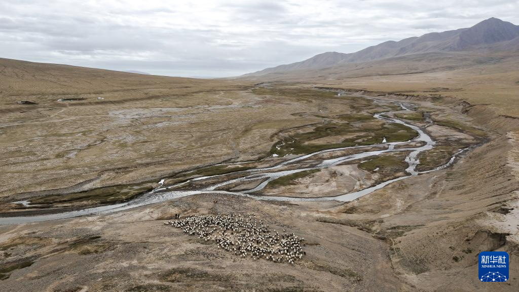 9月9日,在青海省海西蒙古族藏族自治州都兰县,牧民赶着牛羊从秋季草场出发,前往冬季草场(无人机照片)。新华社记者 齐芷玥 摄