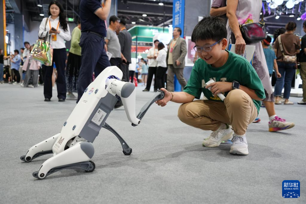 9月13日,小朋友在服贸会展馆内与机器狗握手。新华社记者 周汀鹭 摄