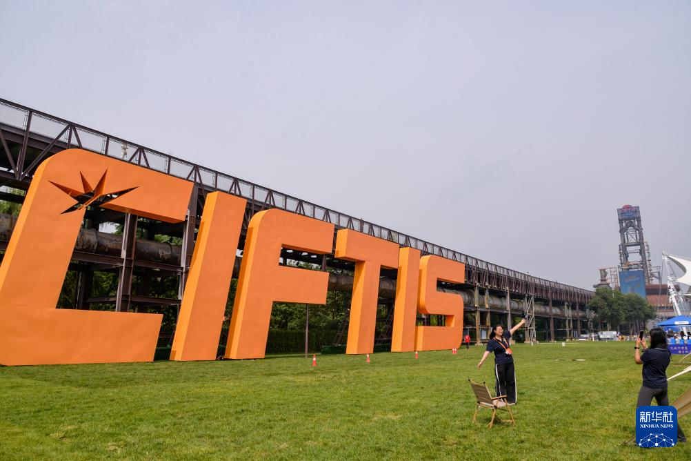 9月13日,工作人员在北京首钢园一处服贸会英文标识前留影。新华社记者 徐钦 摄