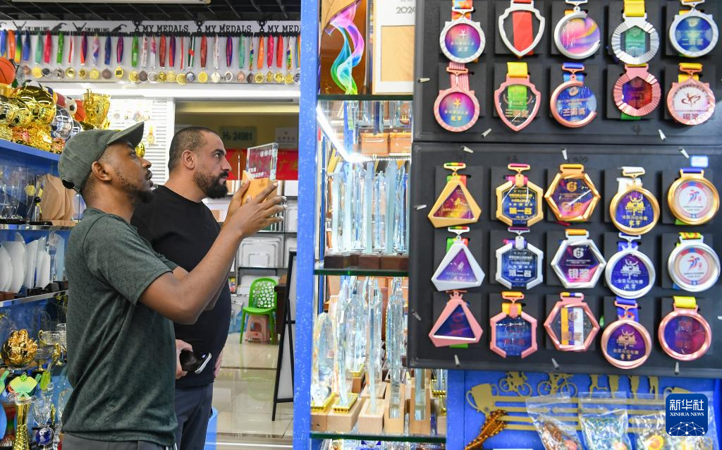 9月15日,外商在浙江省义乌国际商贸城三区商铺采购奖章、奖杯等体育用品。新华社发(时宽兵摄)