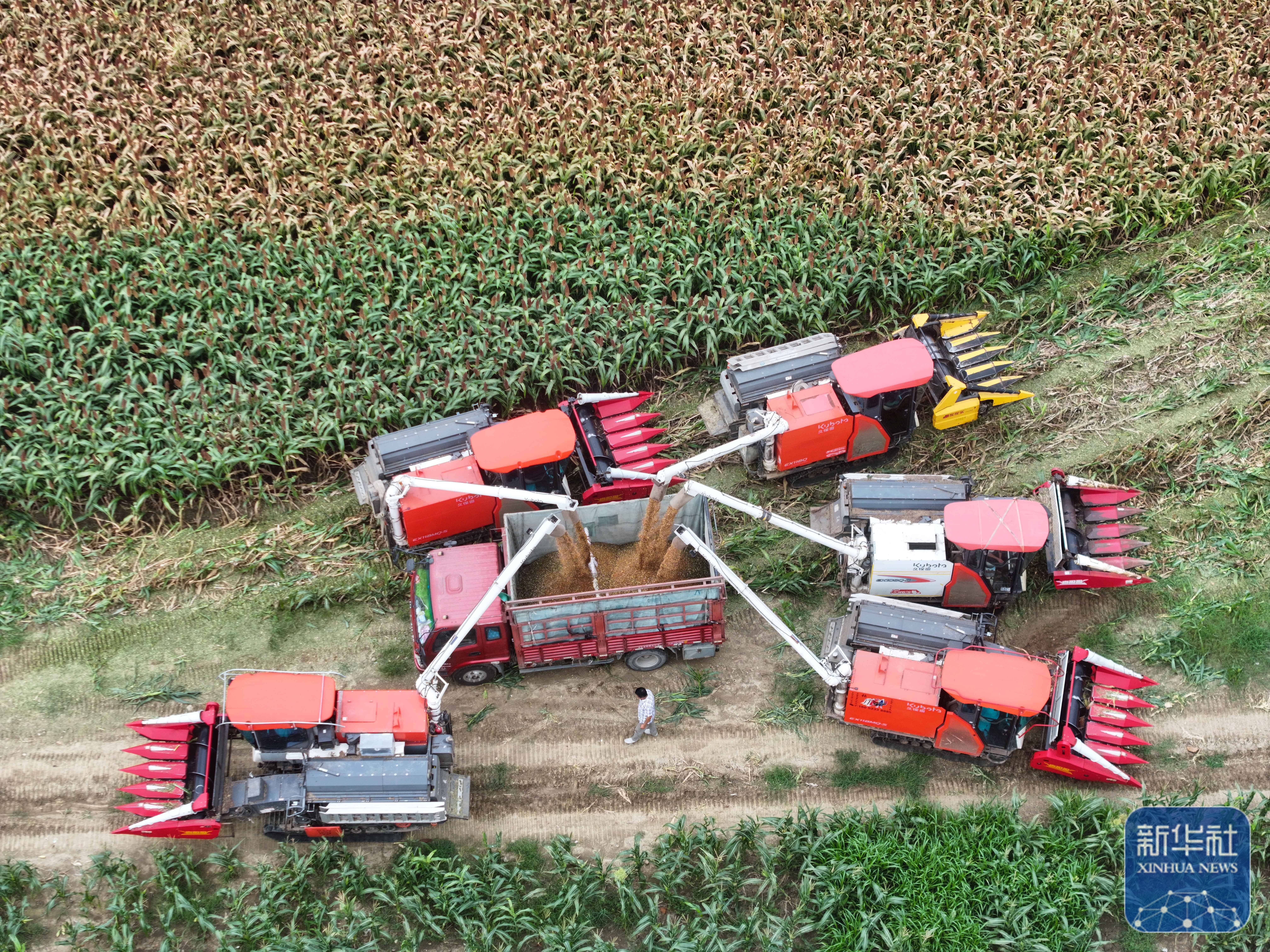 ↑ 9月21日,收割机卸下收割的高粱(无人机照片)。新华社发(许丛军摄)