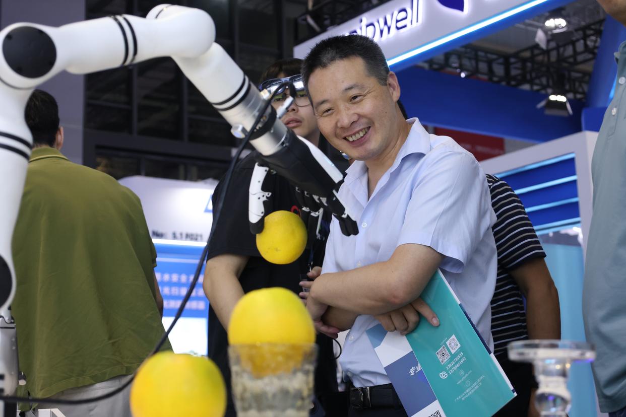 9月23日,参观者在一个进行抓取动作演示的机器手展品前驻足观看。新华社发(潘宗源摄)