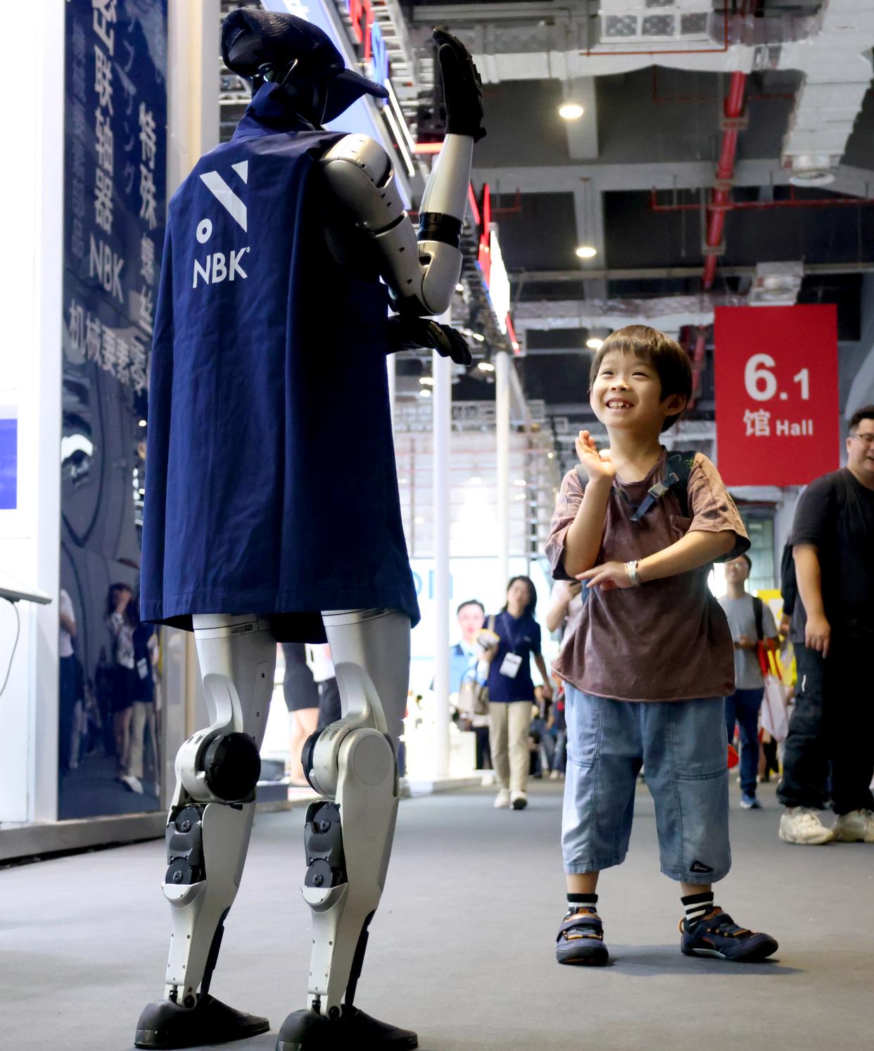 9月23日,小朋友在展会现场与人形机器人互动。新华社发(潘宗源摄)