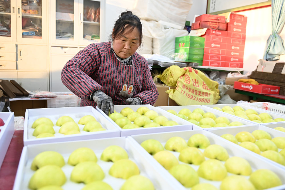 在陕西省渭南市白水县秋林苹果专业合作社,工人打包装箱“瑞雪”苹果(2025年1月9日摄)。新华社记者 李一博 摄