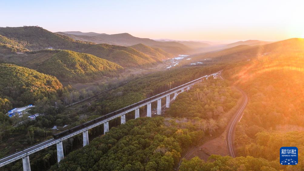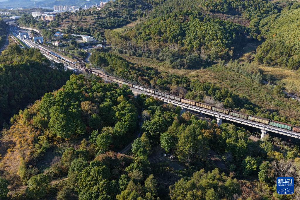 9月27日,满载大宗品类货物的入境列车在滨绥铁路绥芬河至国境线提质改造工程新线路上行驶(无人机照片)。新华社记者 王松 摄