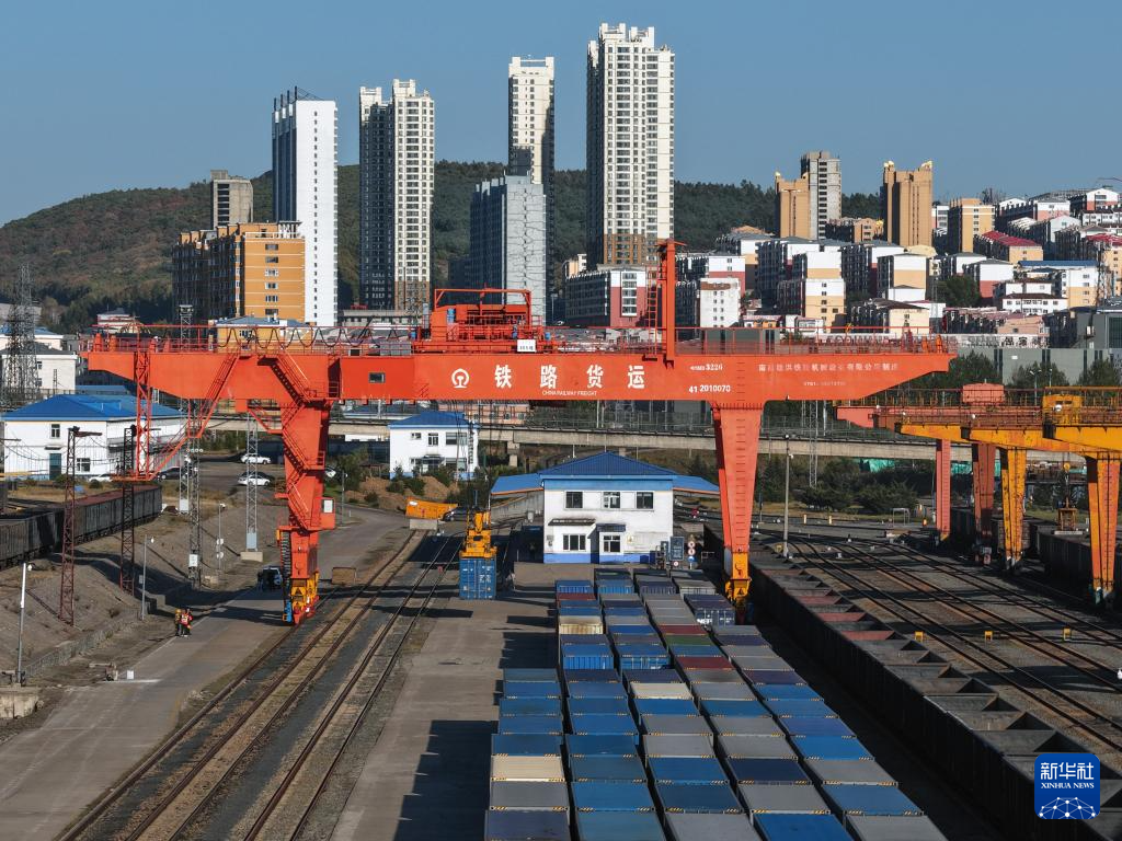 9月27日,满载货物的列车在绥芬河站北场进行换装作业(无人机照片)。新华社记者 王松 摄
