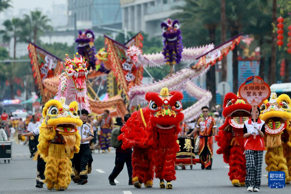 3月1日,广东省肇庆市端州区举行“广府风韵汇星湖 多彩非遗闹元宵”2026肇庆广府文化庙会非遗巡游展演活动。这是南狮表演。新华社发(刘春林摄)