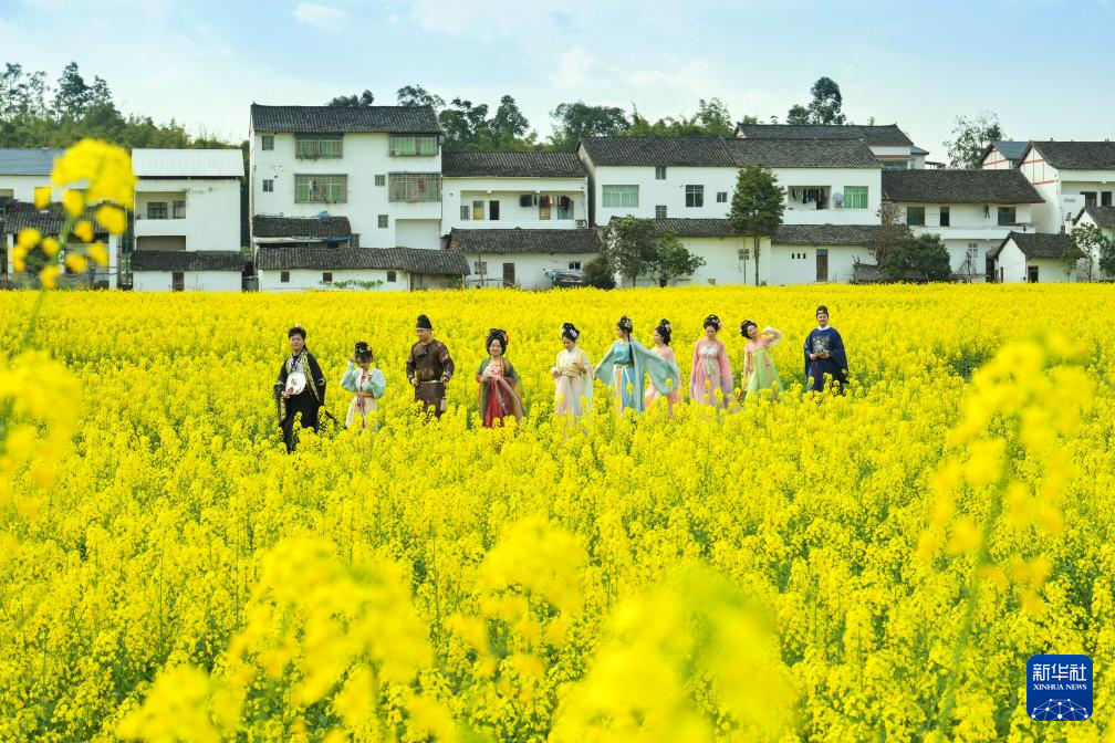 3月5日,一群穿着古装的游客在四川省广安市广安区花桥镇粮油现代农业园区油菜花田中游玩打卡。新华社发(张国盛摄)