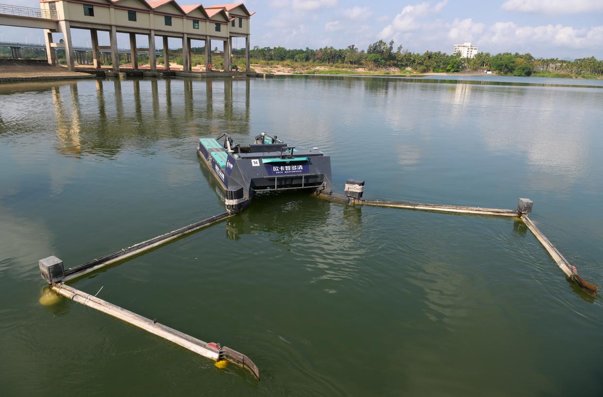 水上智慧环卫无人清洁船在万泉河水面作业(3月25日摄)。新华社记者 杨冠宇 摄
