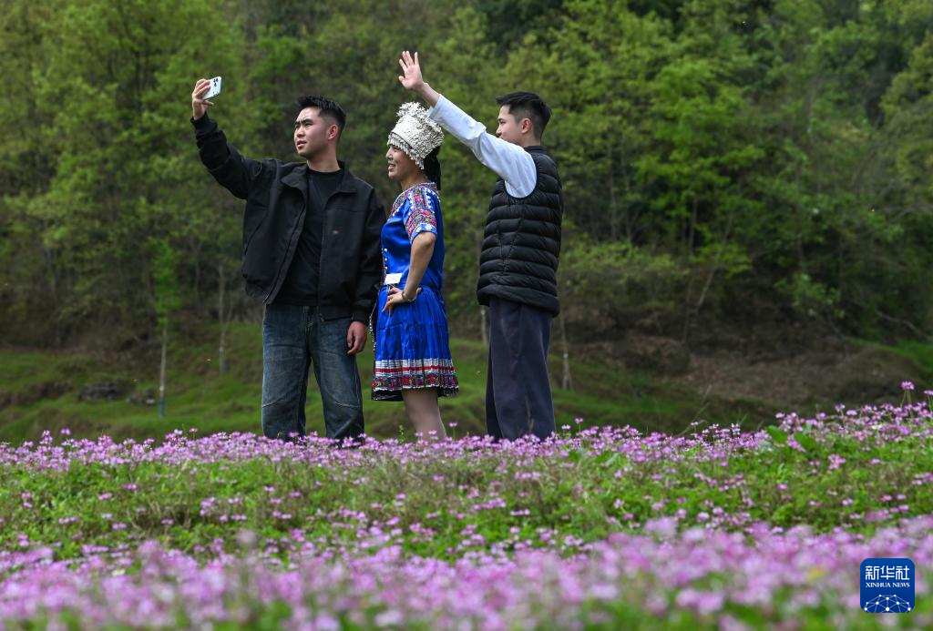 3月26日,在重庆市武隆区石桥苗族土家族乡八角村,游客与当地村民在紫云英花海中合影。新华社记者 陈诚 摄