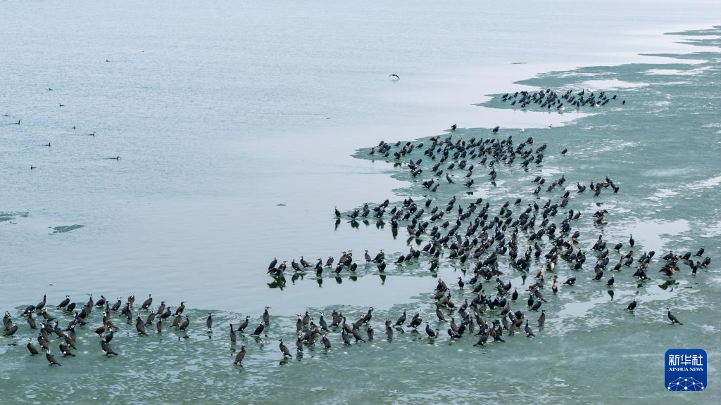 这是3月27日在松花江哈尔滨段一处水域拍摄的鸬鹚群(无人机照片)。新华社发(傅强摄)