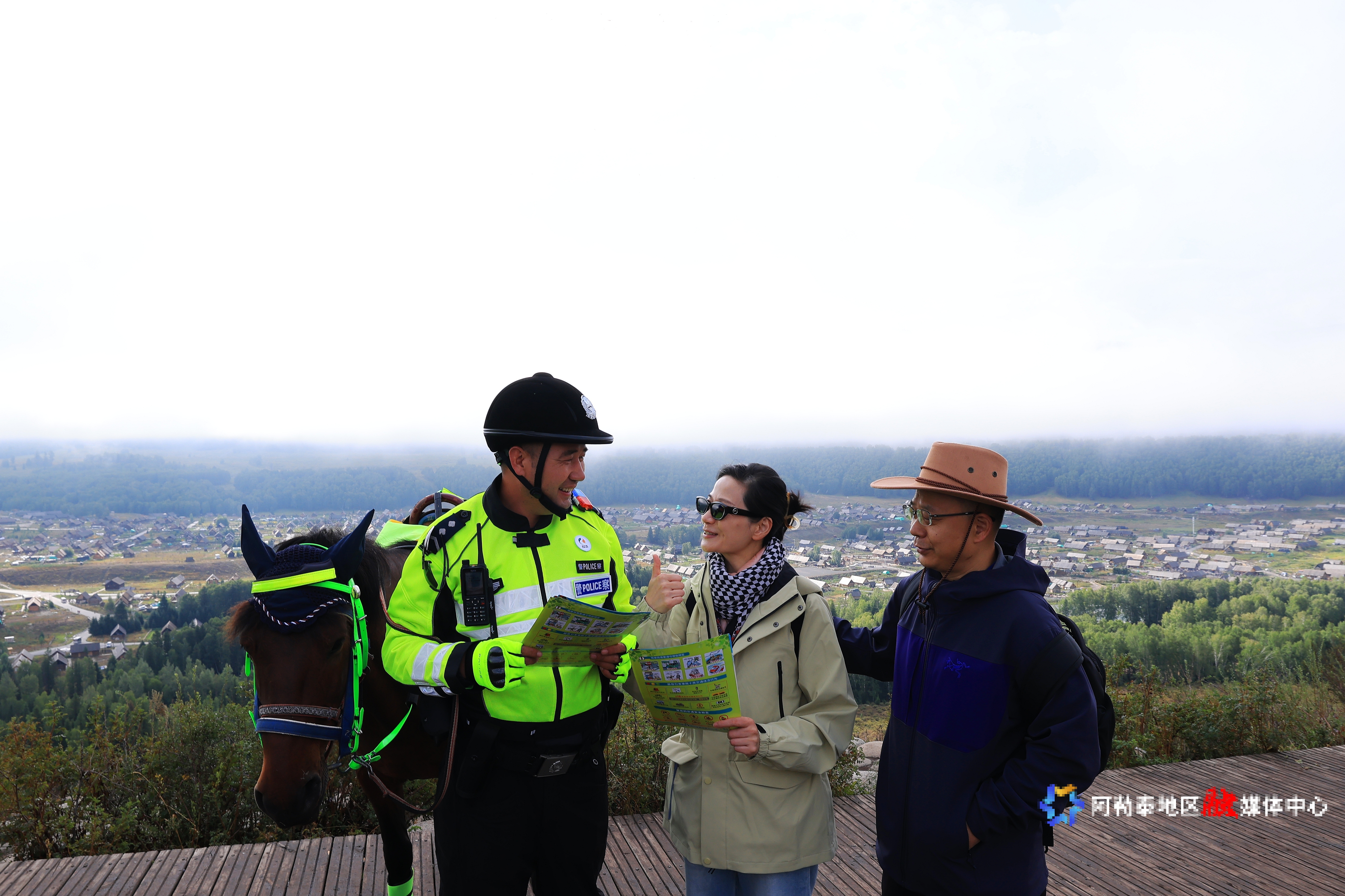 2025年8月16日,喀纳斯公安局骑警在禾木景区内给游客讲解旅游安全知识。记者 阿尔达克·拜斯汗 摄