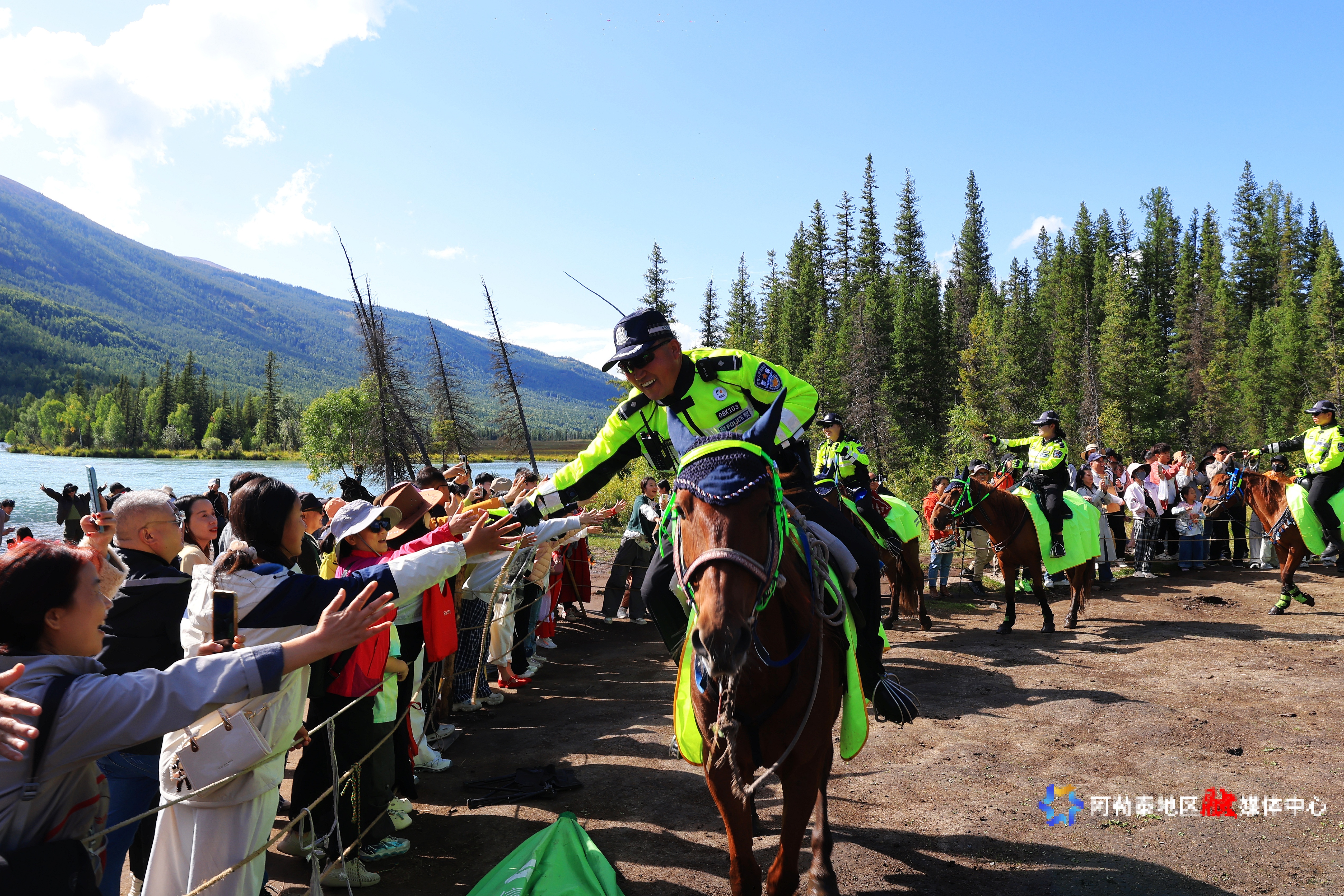 2025年8月16日,喀纳斯公安局骑警们在喀纳斯景区跟游客互动。记者 阿尔达克·拜斯汗 摄