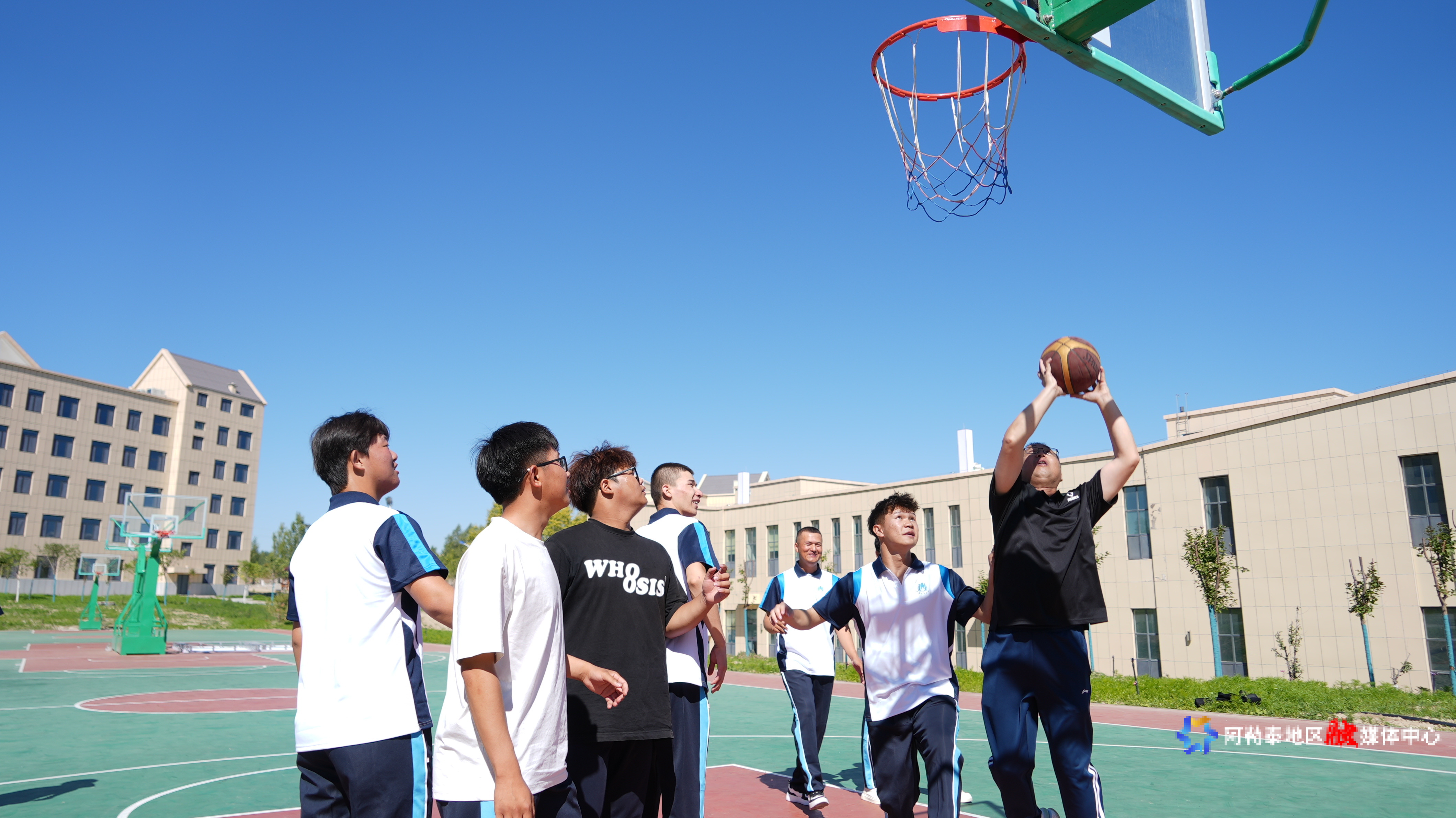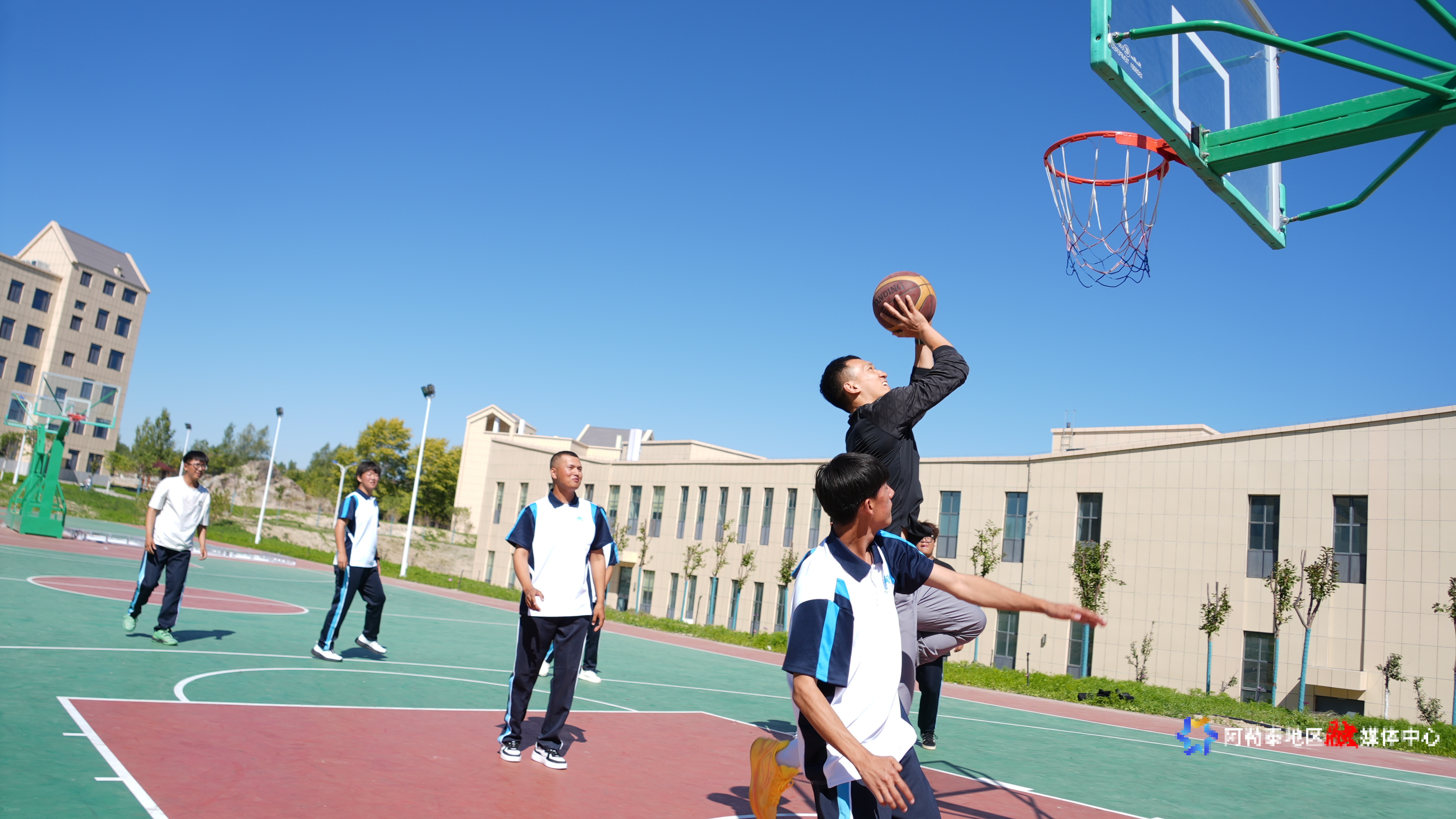 新疆财经大学阿勒泰校区体育老师杨义乐与酒店管理1班同学进行五对五半场教学赛中突破投篮。