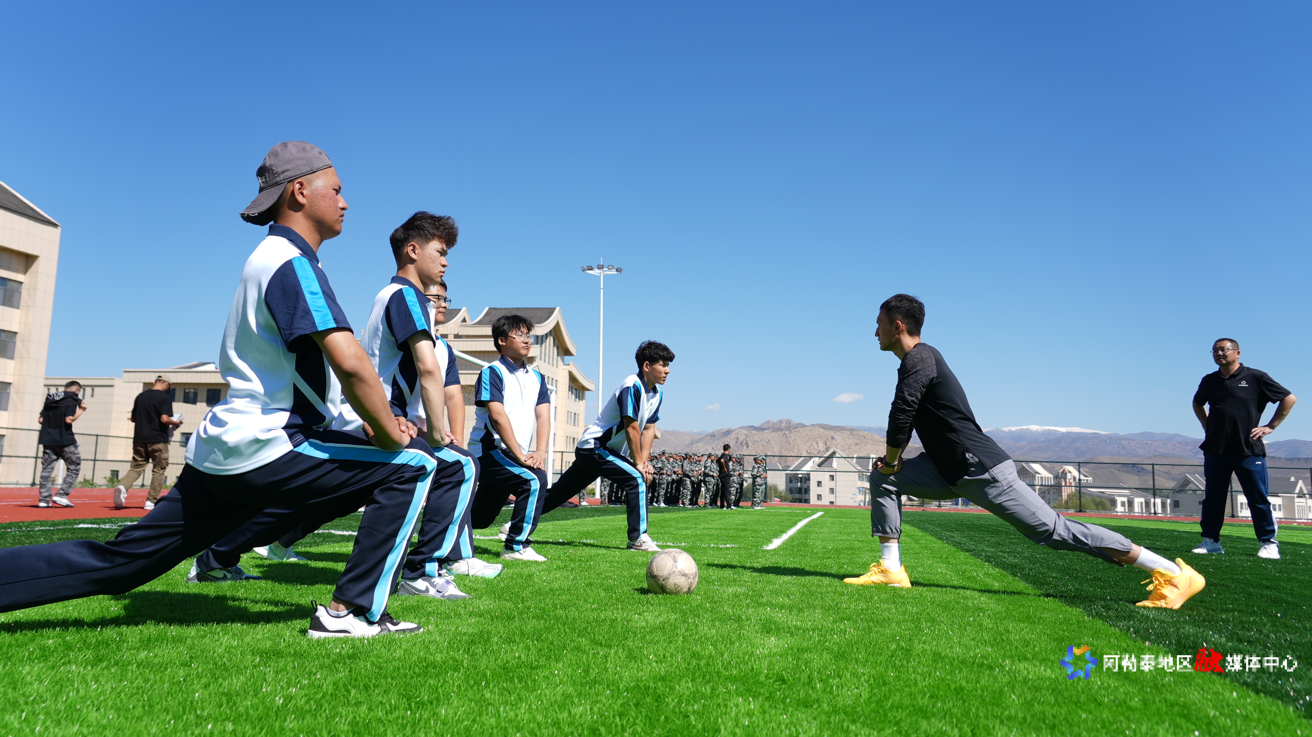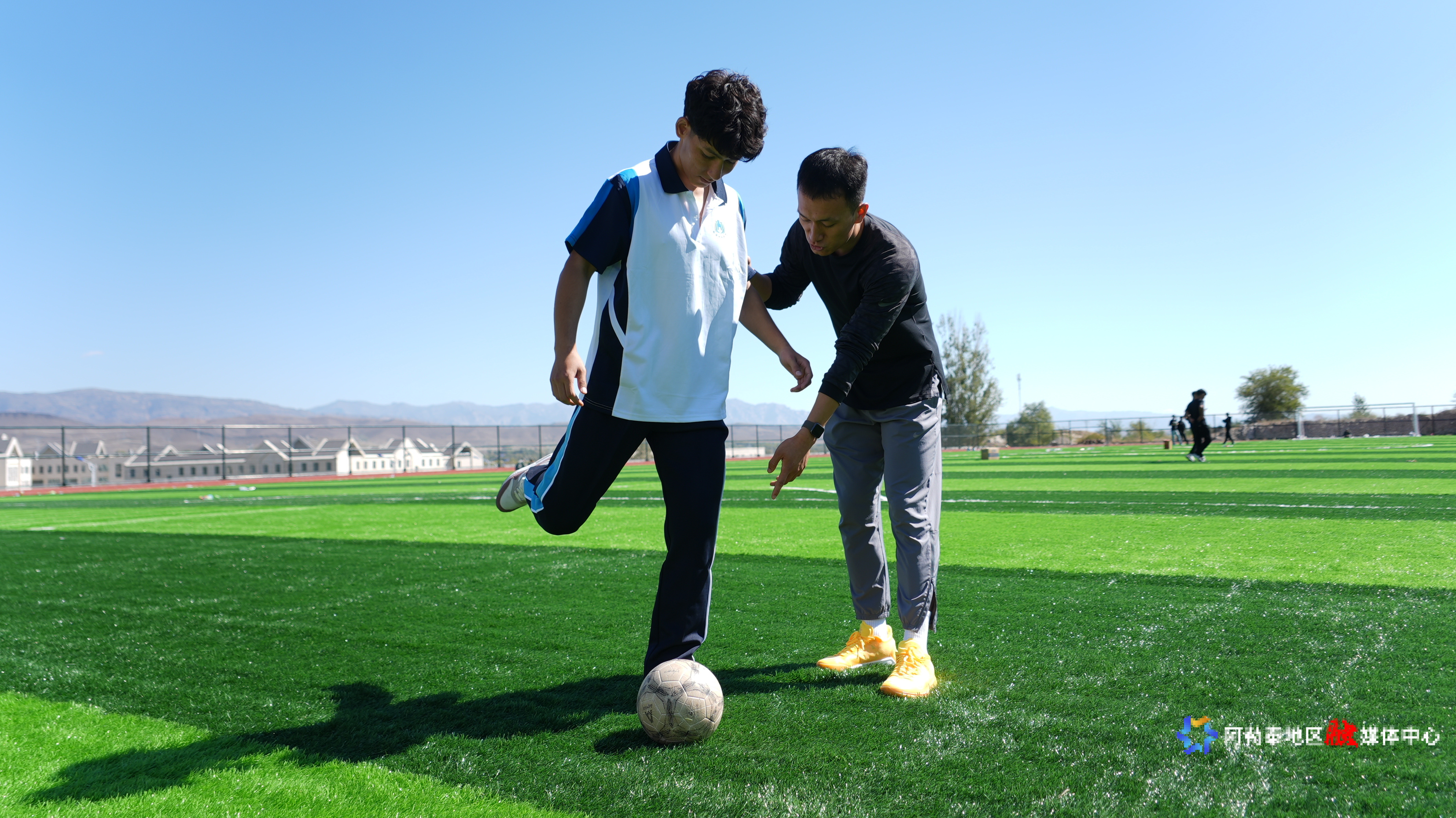 吉木乃县高级中学体育老师 高世忠正在给教学生讲解踢球动作要领。