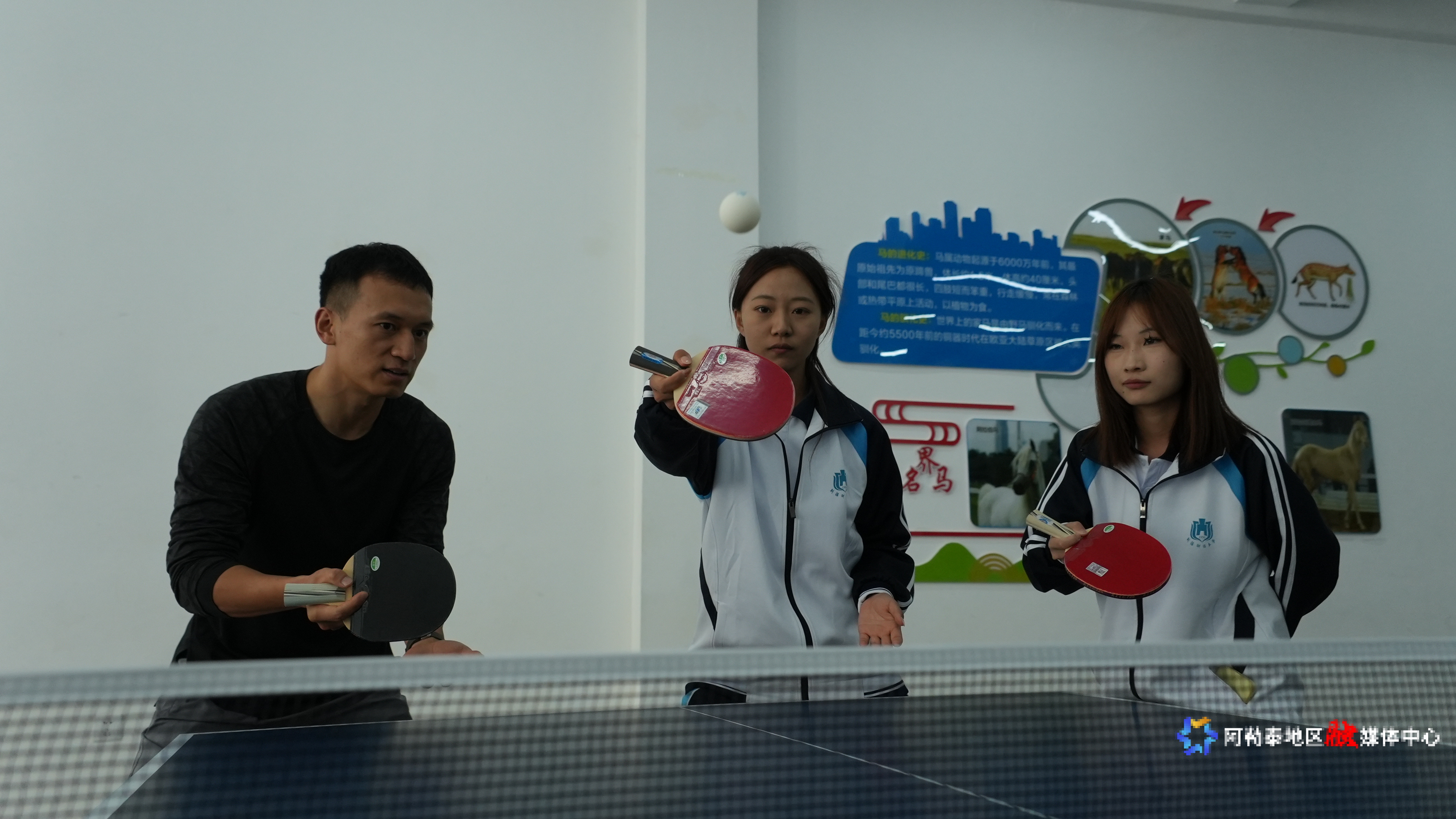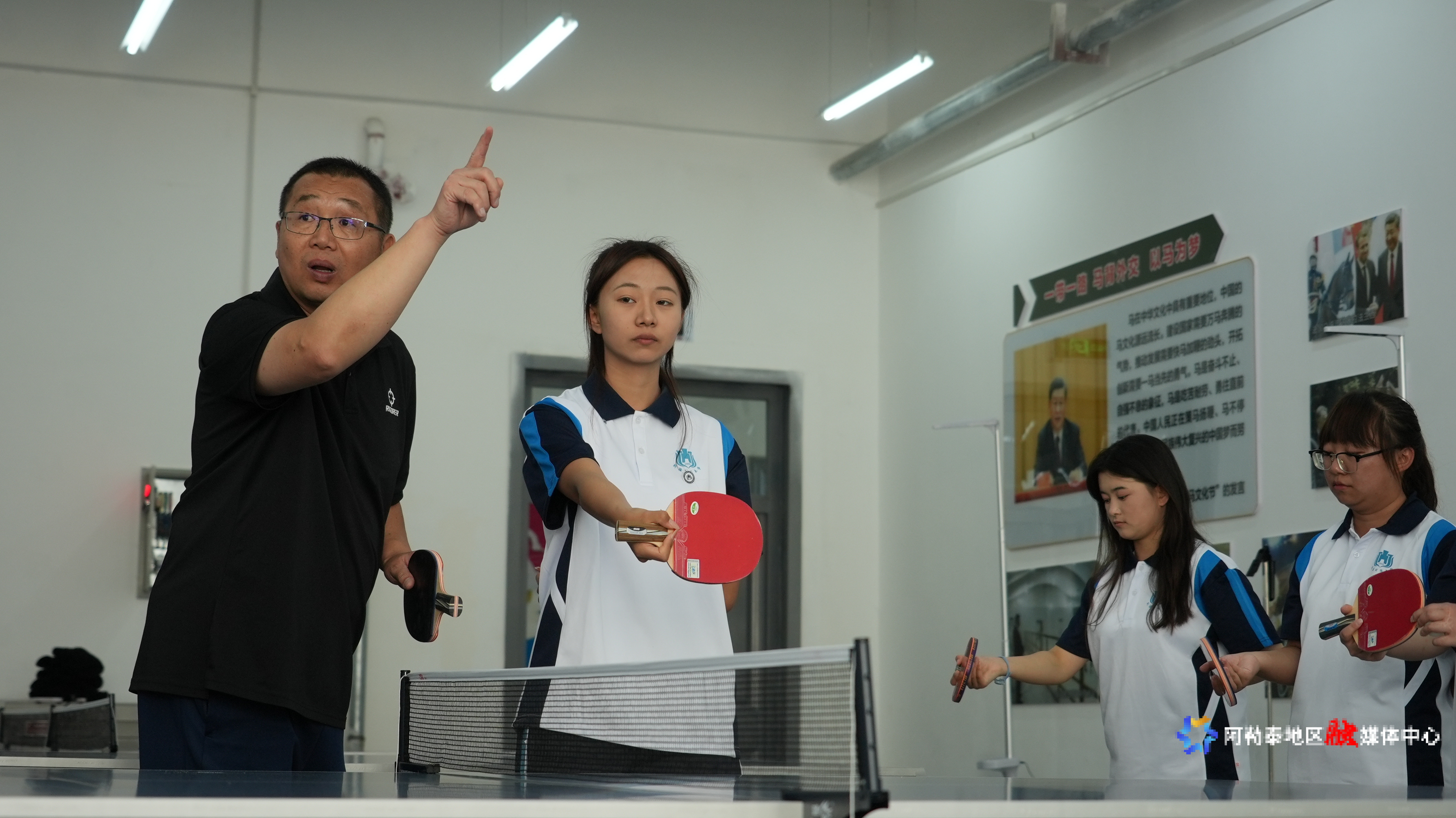新疆财经大学阿勒泰校区体育老师张世敏正在指导酒店管理1班同学乒乓球直板反手推挡技术。