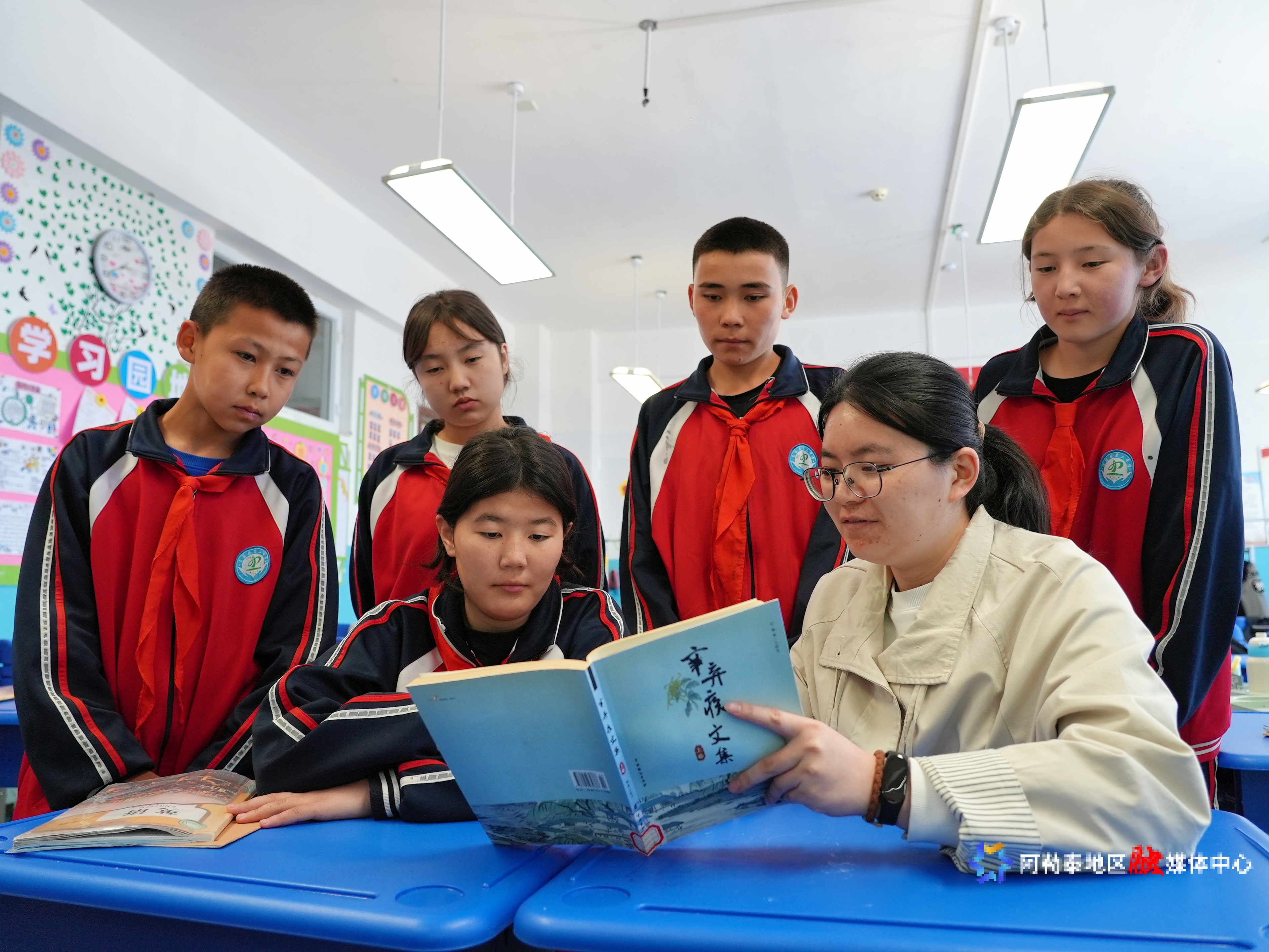 富蕴县第二中学老师正与初中学生开展“共读小时光”活动。