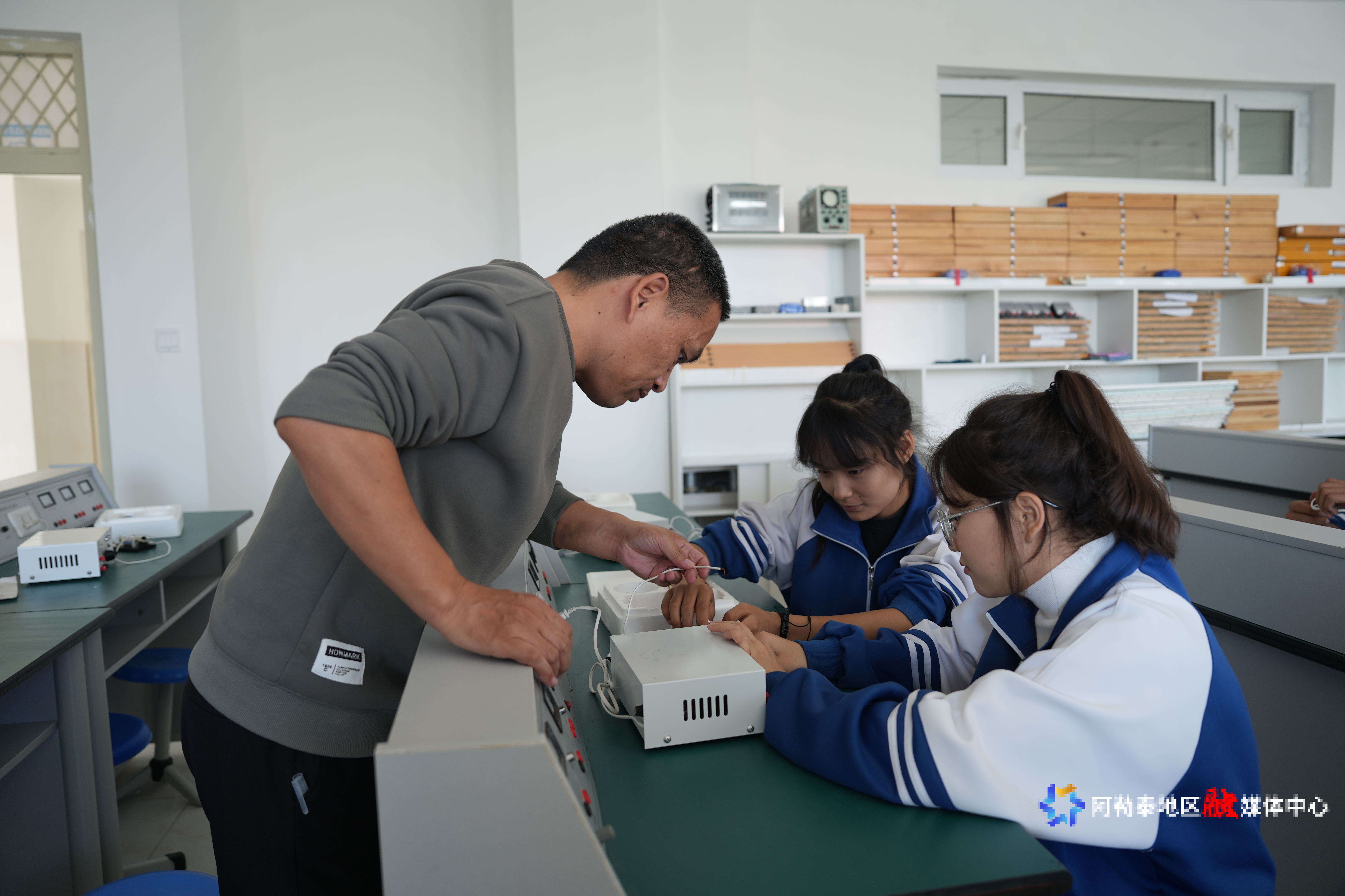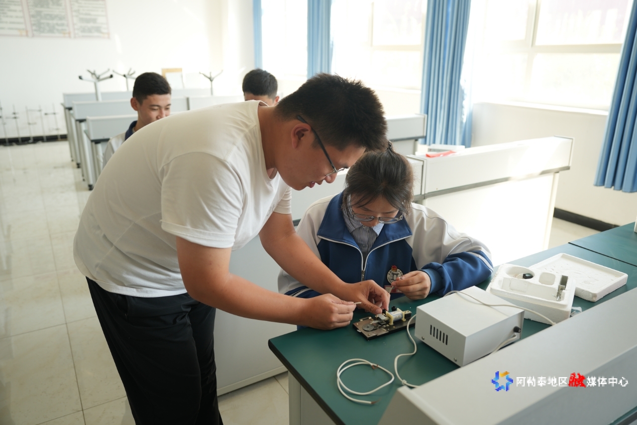 吉木乃县高级中学物理老师李延国老师正在带学生做物理实验。