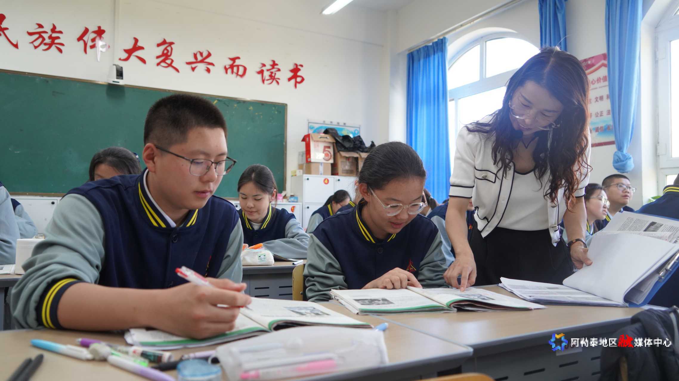 阿勒泰地区第二高级中学,教师正为学生指导课文。