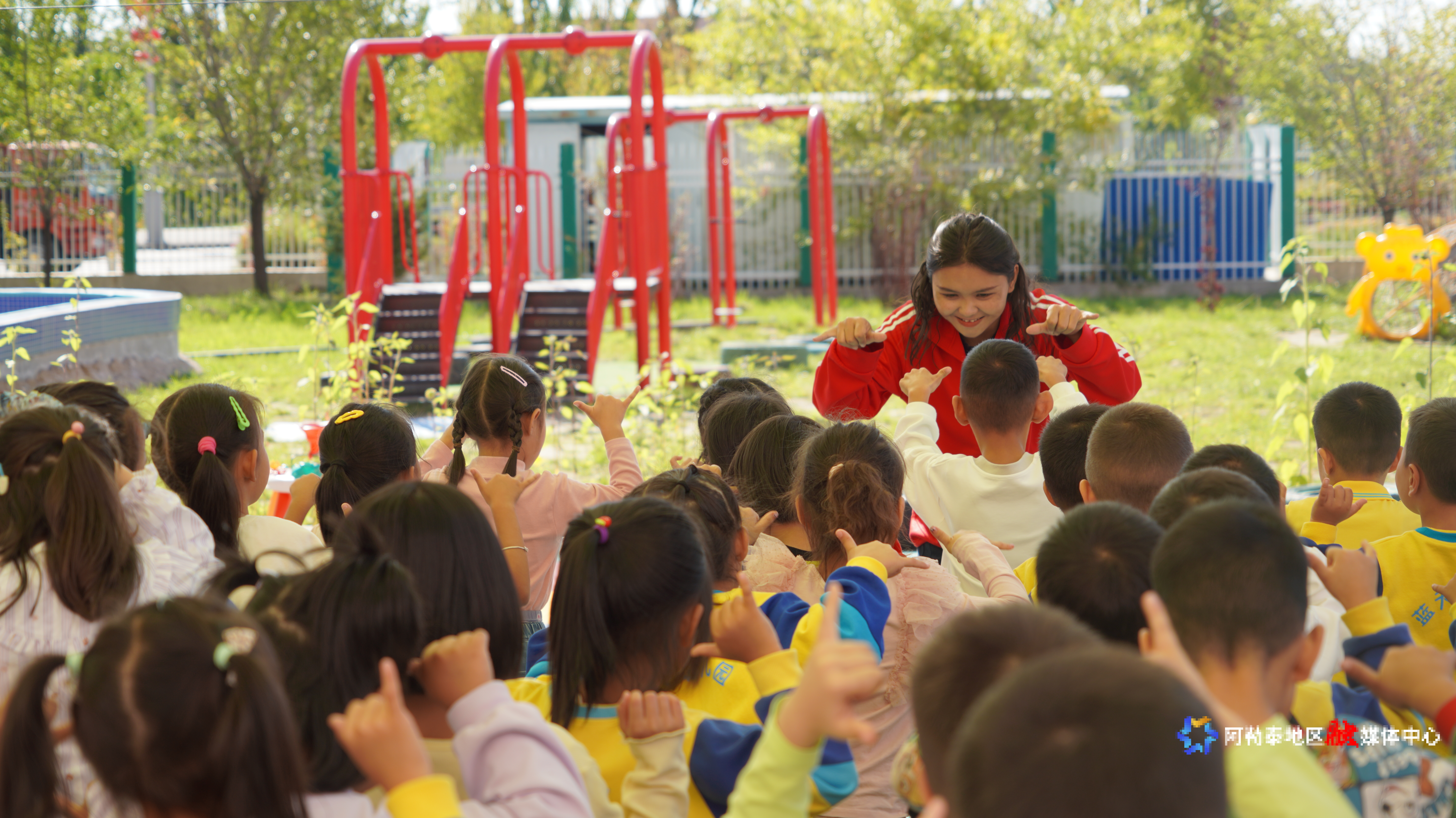 阿勒泰市蓝天幼儿园的老师和孩子们一起做游戏。