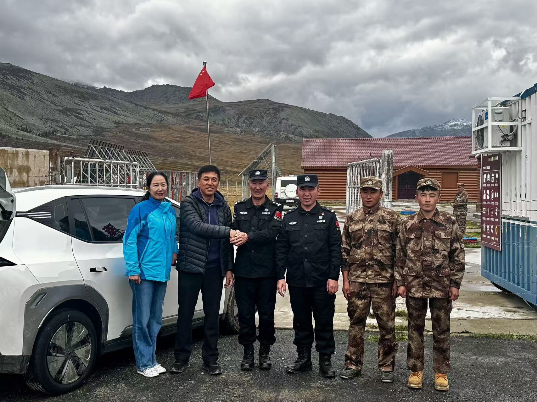 当日,阿勒泰边境管理支队拉斯特边境派出所民警在阿禾公路沿线巡逻时,发现一辆打着双闪的黑龙江牌照车辆停在路边,便上前了解情况。经询问得知,齐先生一家自驾至阿勒泰旅游观光,车辆在行驶中突然爆胎,因缺乏换胎经验,面对故障一筹莫展。