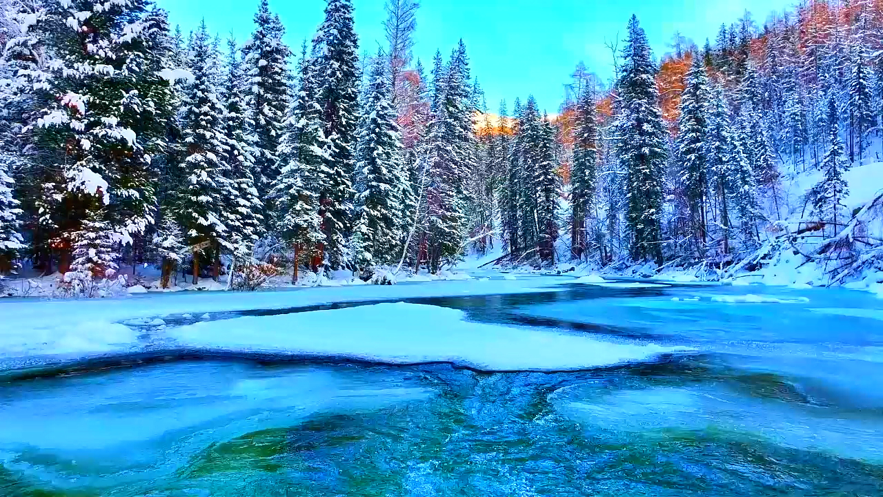 幽蓝冰河淌,揉碎雪林清冷绘成流动画。