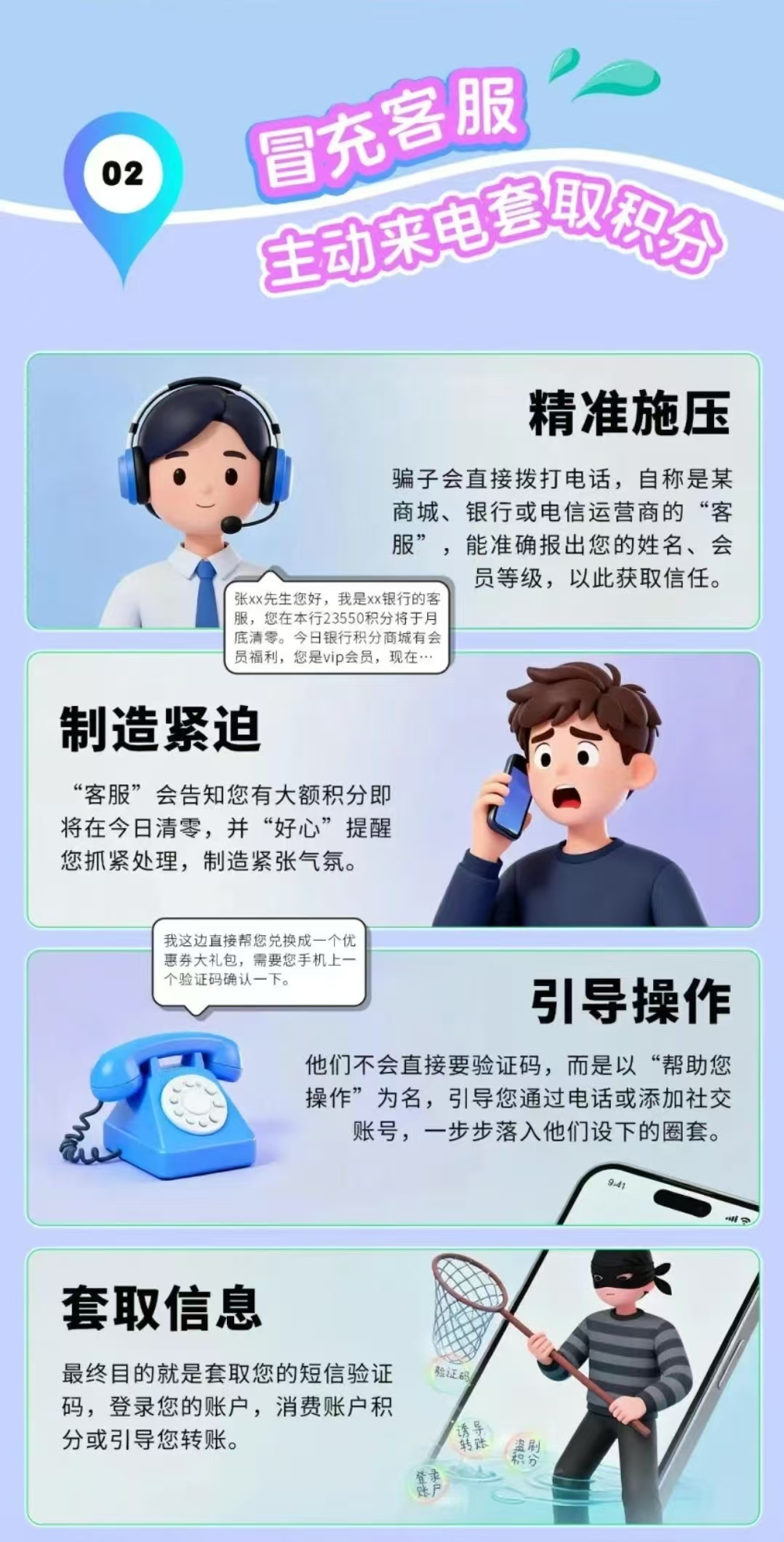 据该公司工作人员介绍,“积分清零”骗局主要分为两类。第一类是钓鱼短信诈骗:诈骗分子伪装成运营商、银行或电商平台等,发送“积分即将过期”“尽快兑现”等短信,附带的“兑换链接”实为高度仿真的钓鱼网站,会诱导用户输入账号、密码等支付信息,后续诈骗分子会以“补差价”“付运费/税费”等名义,催促用户转账或支付,一旦用户操作,银行卡内资金便会被迅速转走。第二类是冒充客服来电诈骗。骗子自称某平台客服,能准确报出用户姓名、会员等级等信息,以“积分即将清零”制造紧迫感,以“协助兑换”为名引导用户通过电话操作,逐步套取短信验证码并登录用户账号,进而盗刷积分或诱导转账。