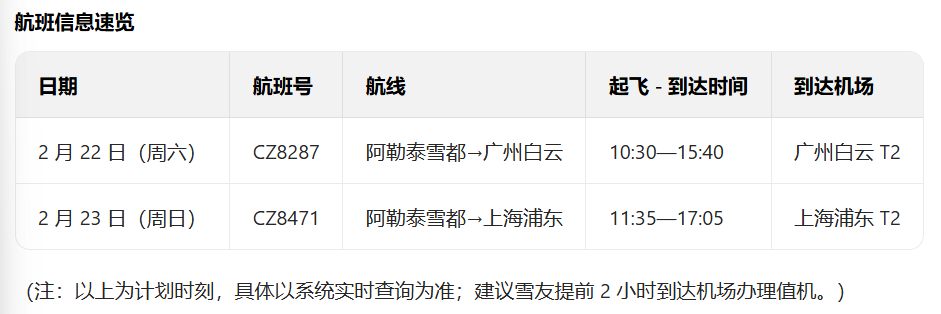 助力雪友返乡 南航将新增阿勒泰至广州、上海单向航班