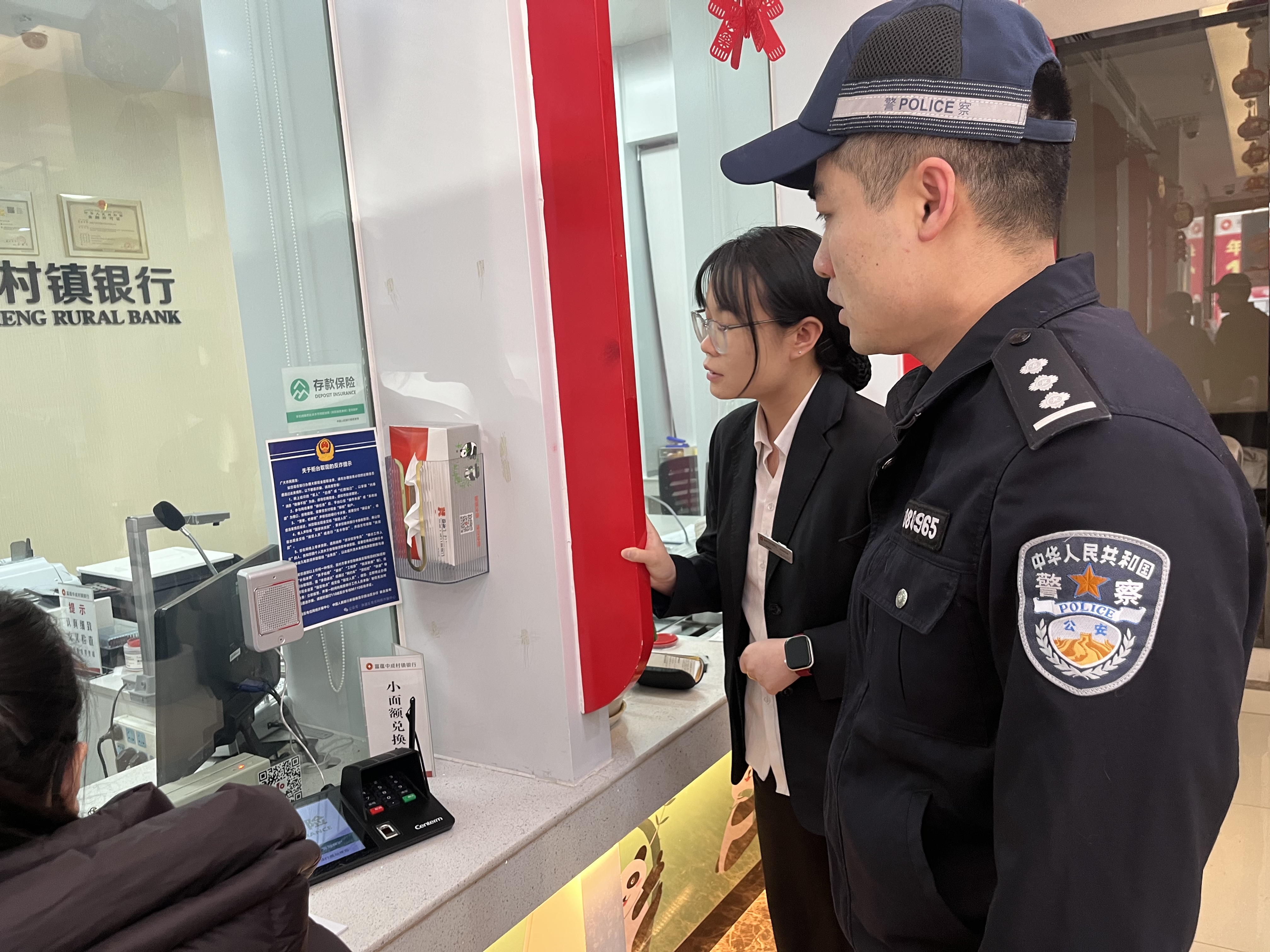 2月26日富蕴县公安局反诈中心民警何超进富蕴县中国人民银行进行反诈提示。通讯员阿依努尔·别克努尔摄