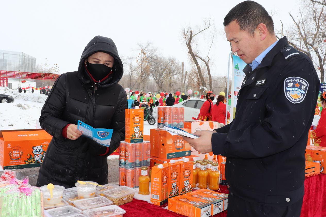 元宵节当天,民警走进青河县社火活动现场,向摊主普及反诈知识。