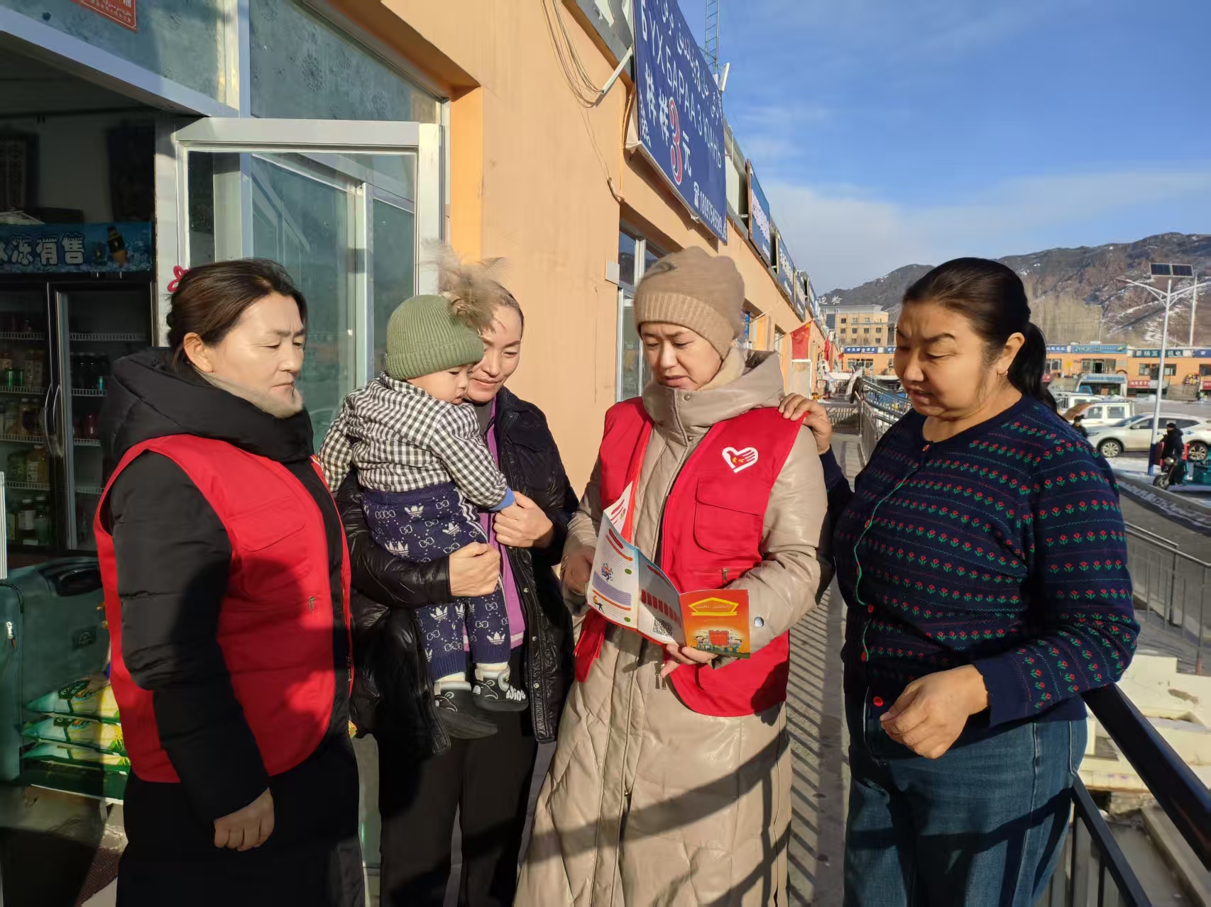 青河县塔克什肯镇干部为商户进行好家风宣传。