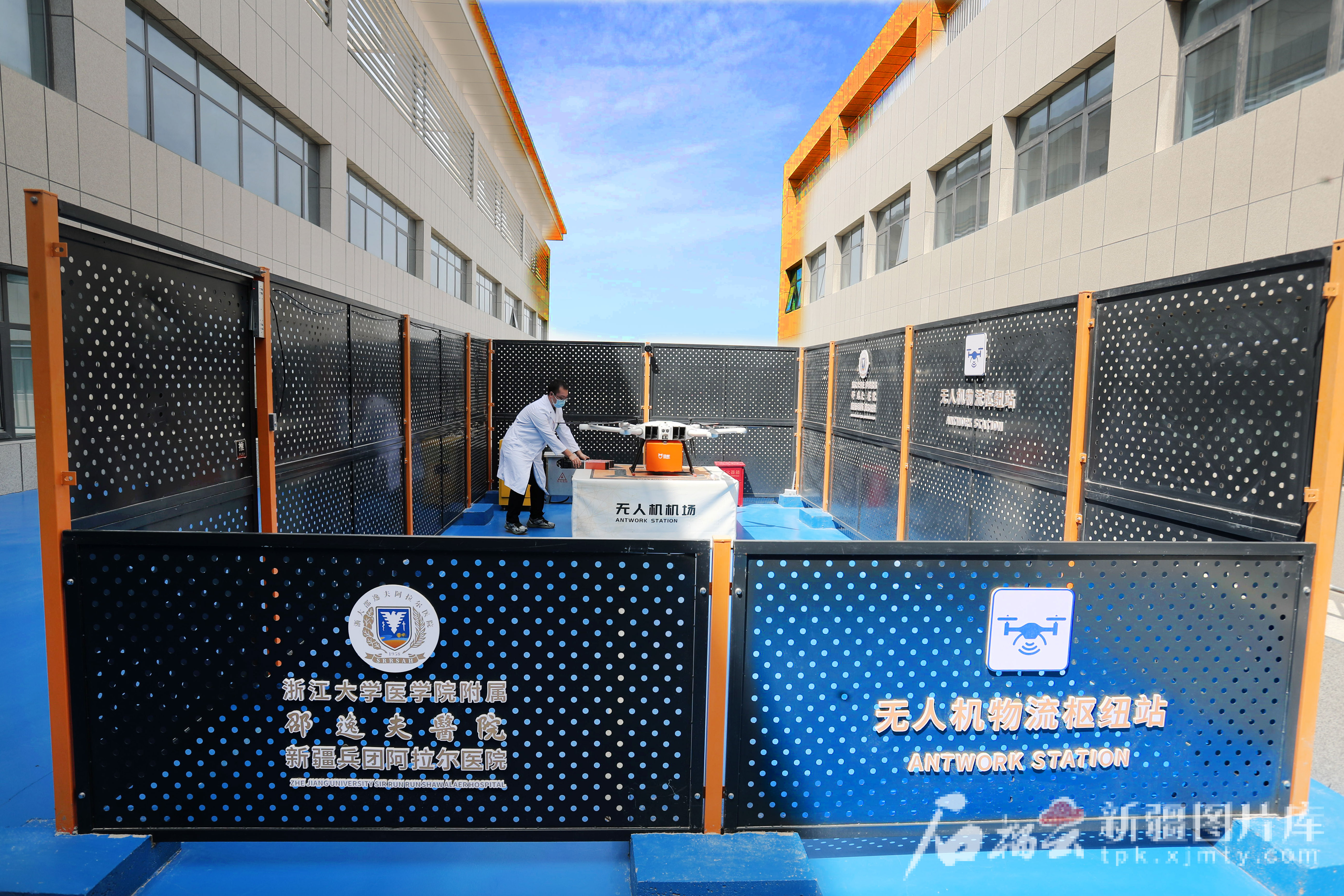 8月12日,浙江大学医学院附属邵逸夫医院新疆生产建设兵团阿拉尔医院专业操控人员在操作物流无人机。