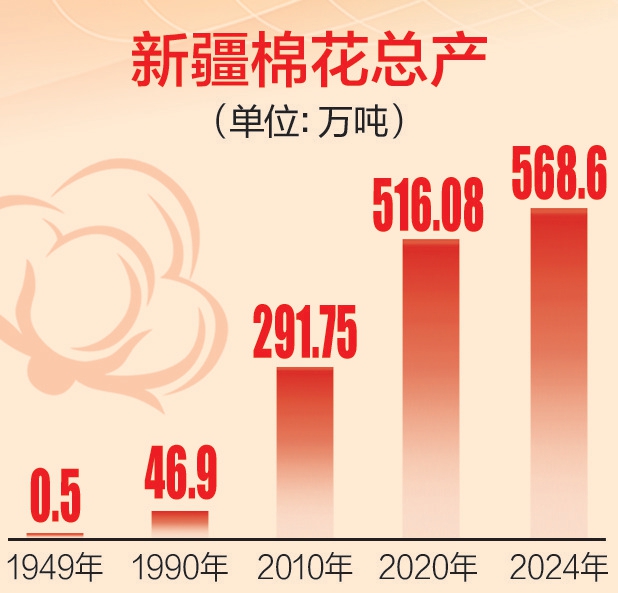 2024年,新疆棉花总产由1949年的0.5万吨增长至568.6万吨,产量占全国的比例由1.1%提升至92.2%,总产、单产连续30年全国第一。世界棉花看中国,中国棉花看新疆已是不争的事实。