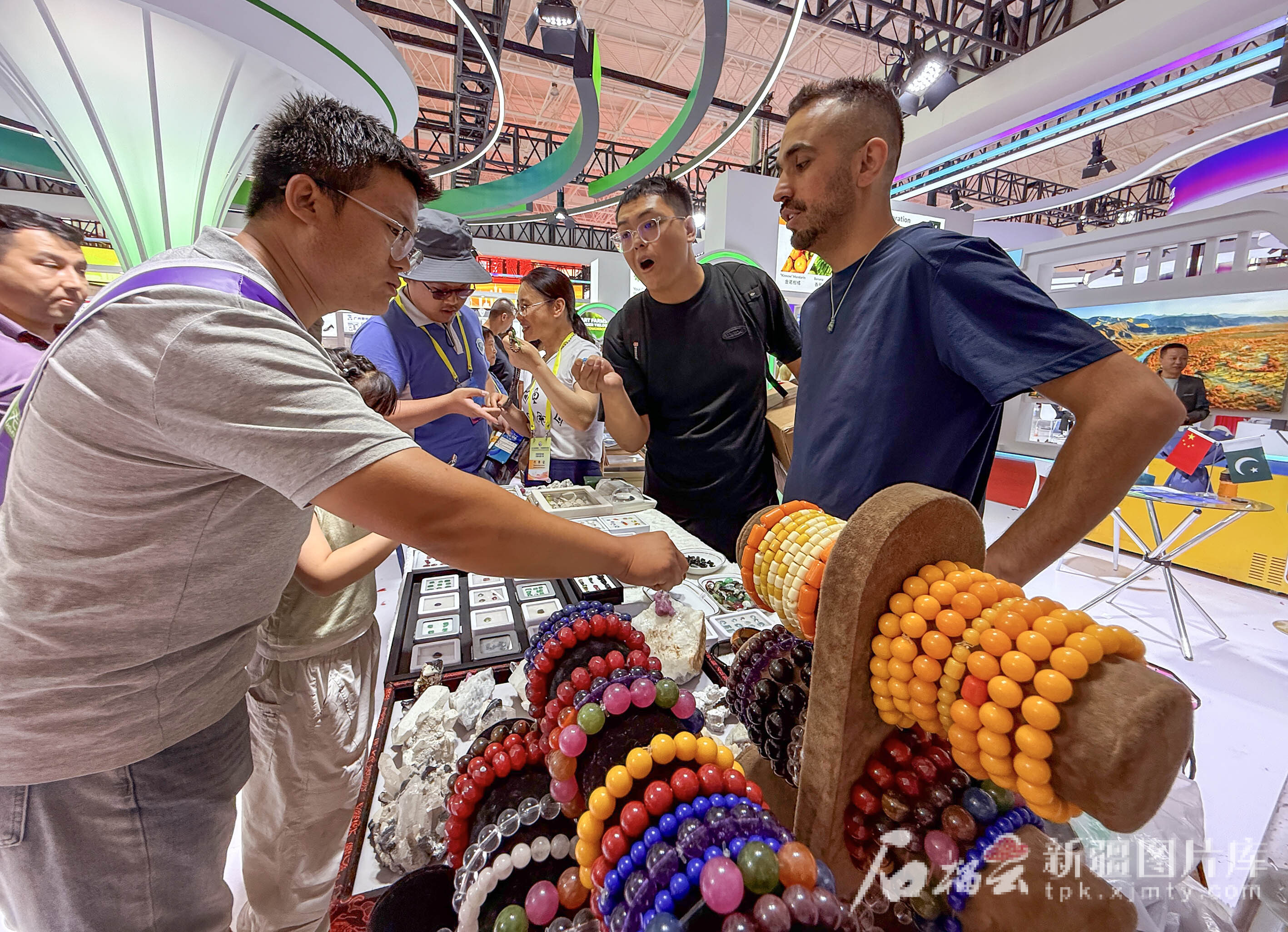 8月15日,参展客商在巴基斯坦展位选购珠宝。