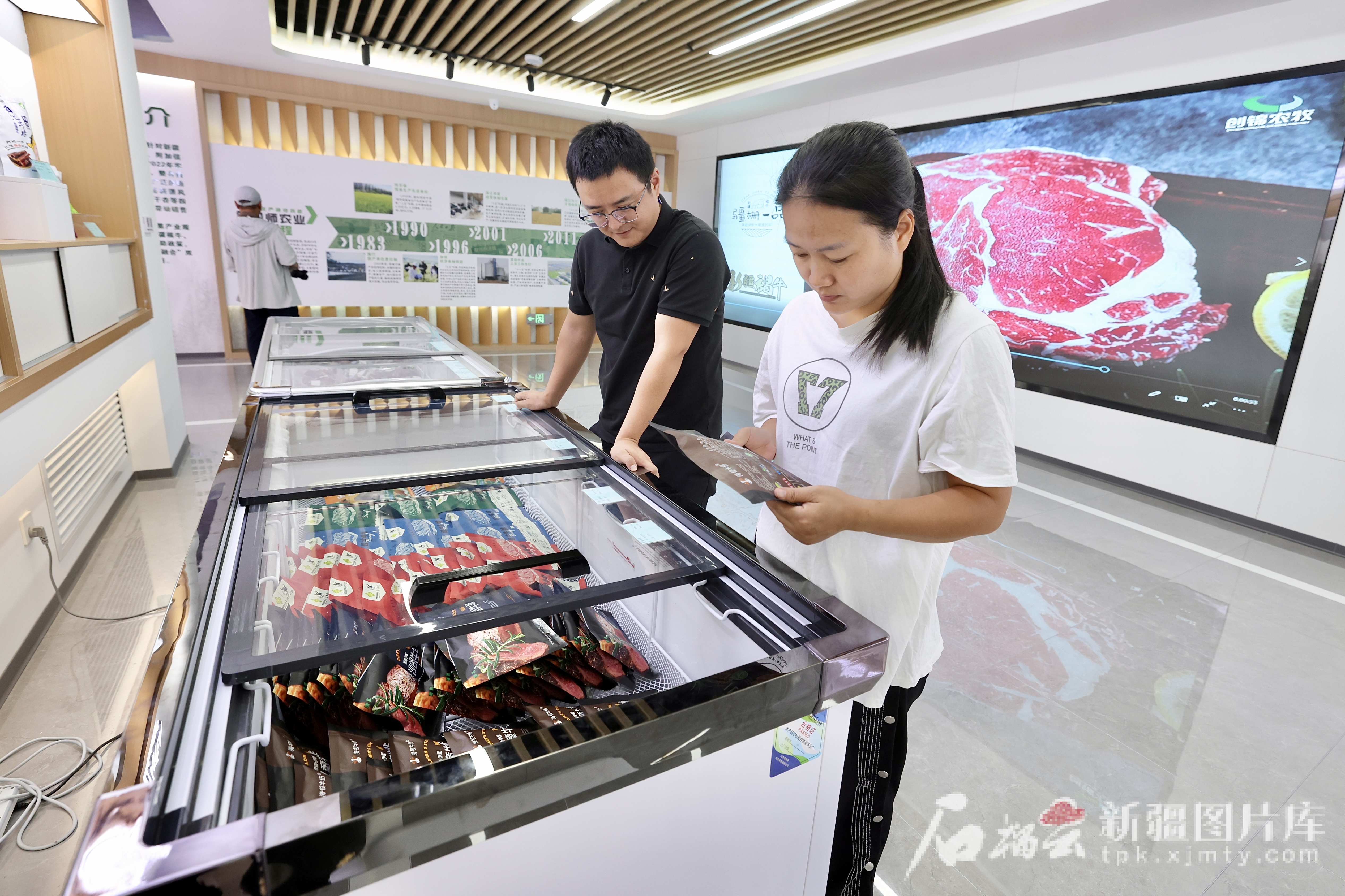 8月17日,游客在“润疆情”农特产品集中采购仓选购牛肉。