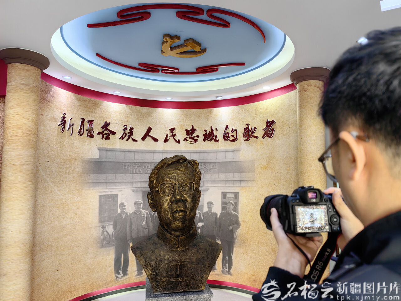 9月8日,采访团成员在伊宁市巴彦岱村王蒙书屋拍摄。