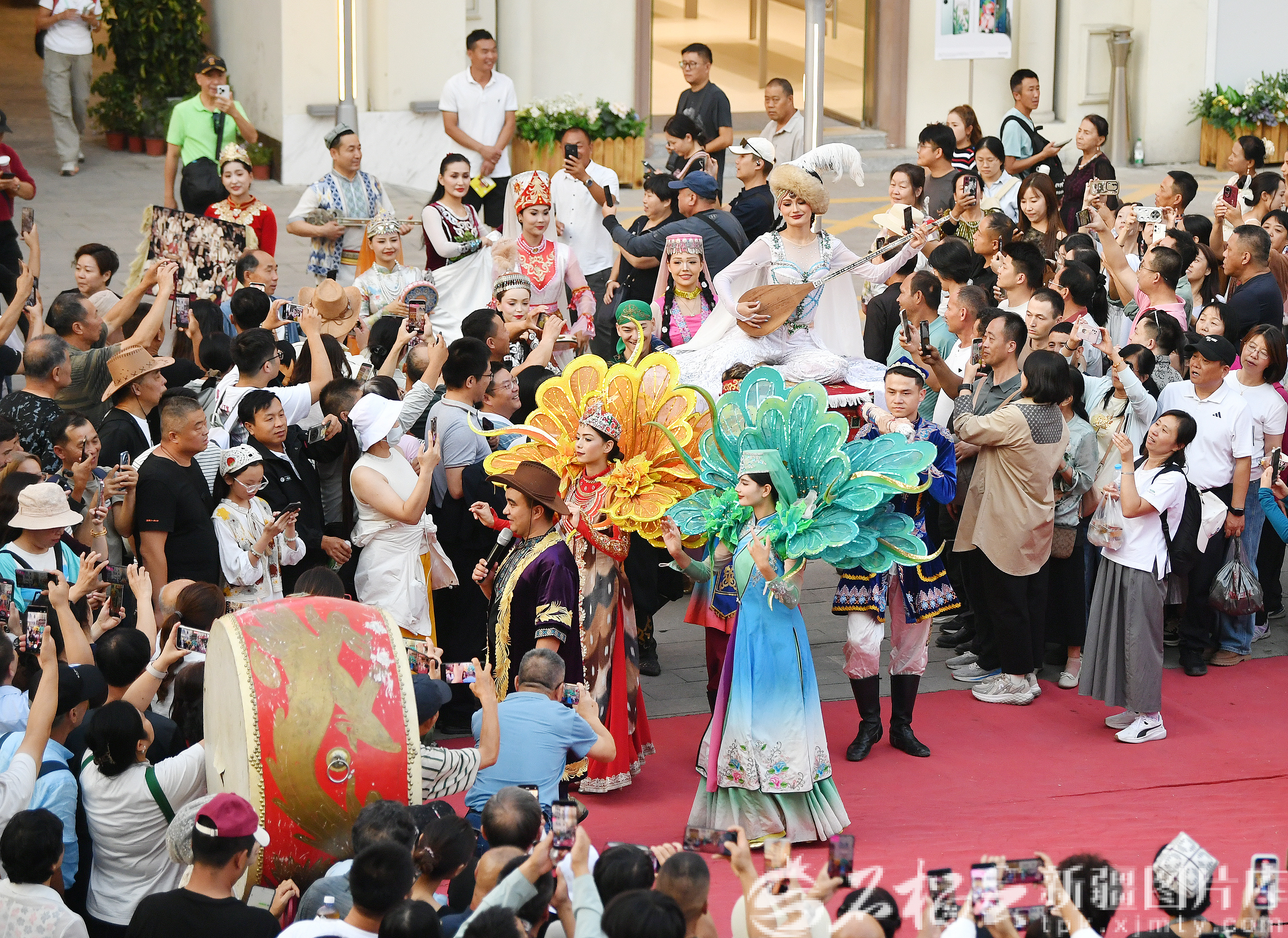 9月8日,游客观看、拍摄新疆国际大巴扎疆来城的文艺表演。